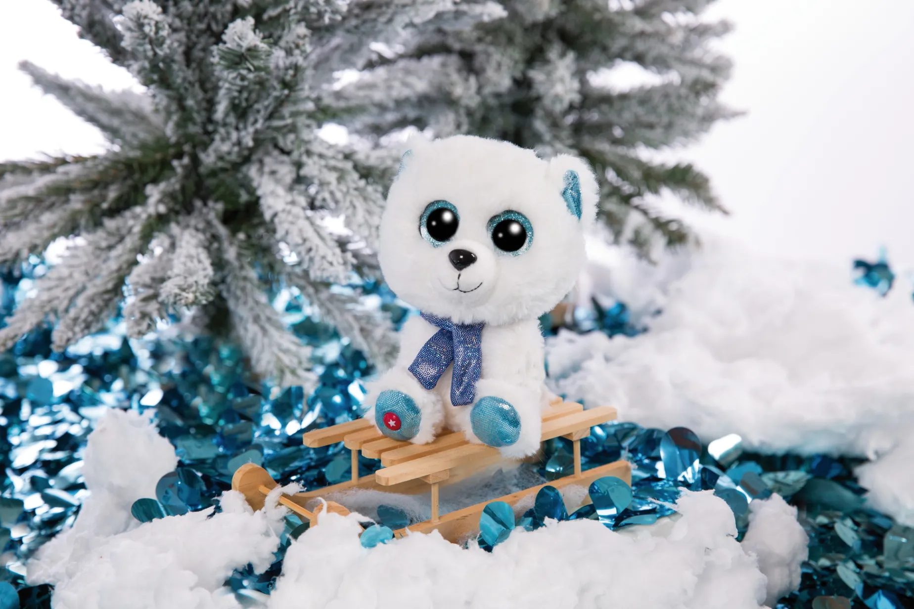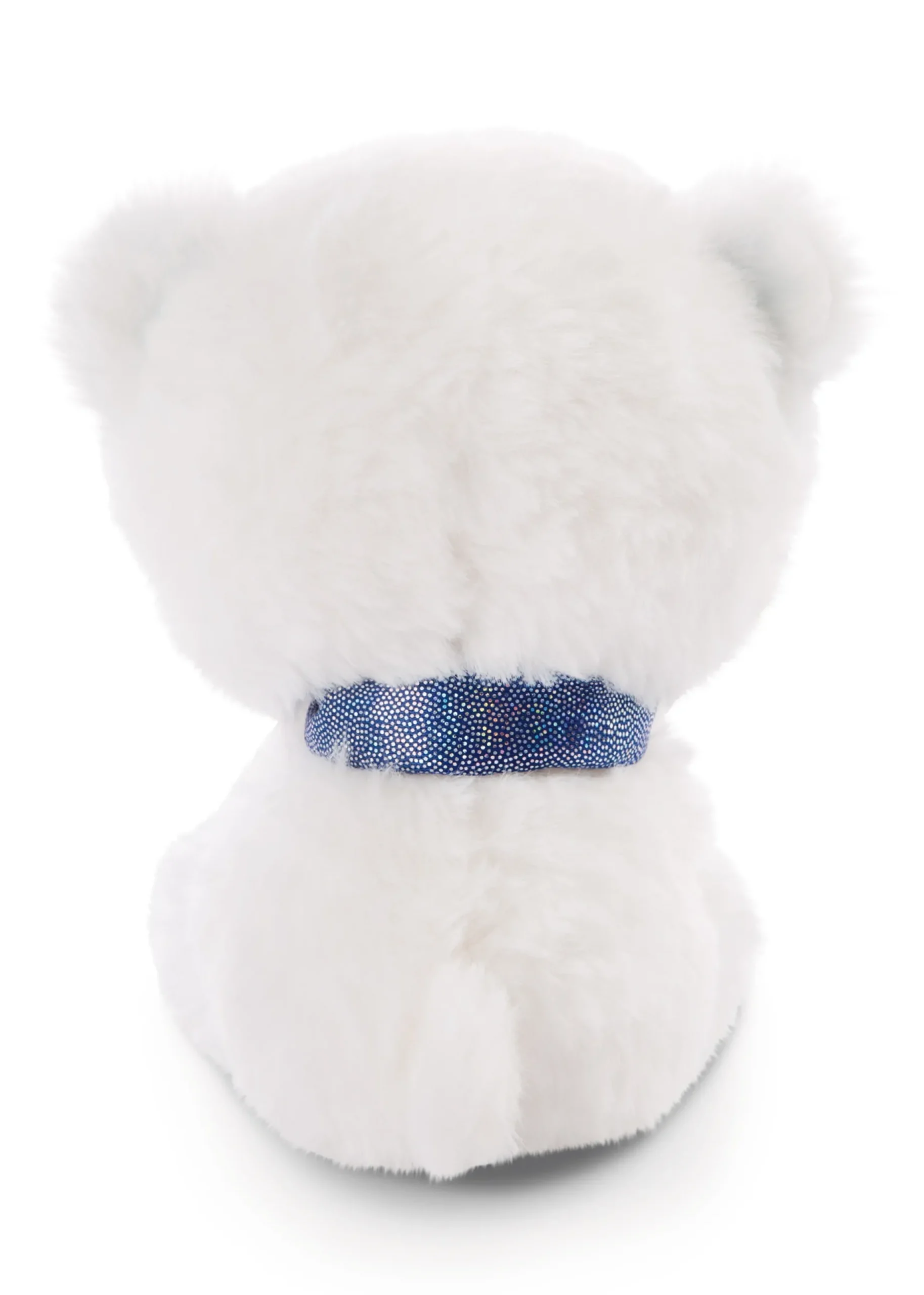 ‘The GLUBSCHIS – the original only from NICI. The GLUBSCHIS cuddly toy polar bear Benjie is a fluffy white polar bear with blue glittering ears and paws! The shimmering blue scarf is especially cute and keeps GLUBSCHIS nice and warm in the winter snow storms!c 2021 Carletto, licensed by NICI GmbH ‘