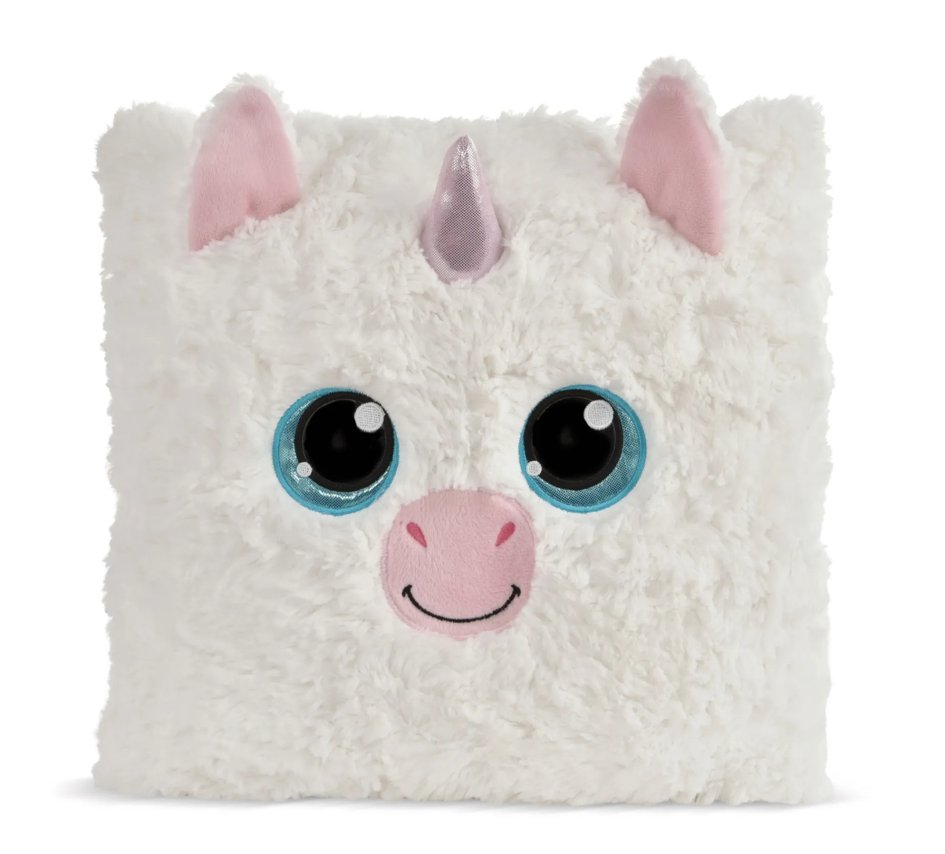 The square-shaped plush cushion GLUBSCHIS Unicorn Milky Fairy is not only fluffy soft, but also fascinates with a charming facial expression, big, blue glitter eyes, a shiny pink forehead horn and cute little ears in a 3-D look. The cushion made of cream-coloured NICI plush is a wonderful eye-catcher and decorative element for the children’s room. Whether as a cuddly cushion for sleepover parties or on trips, as a comfortable headrest for reading or sleeping or simply as another collector’s item for your own GLUBSCHIS plush world – the GLUBSCHIS cushion is the perfect gift for young and old GLUBSCHIS or unicorn fans. (c) 2022 Carletto, licensed by NICI GmbH
