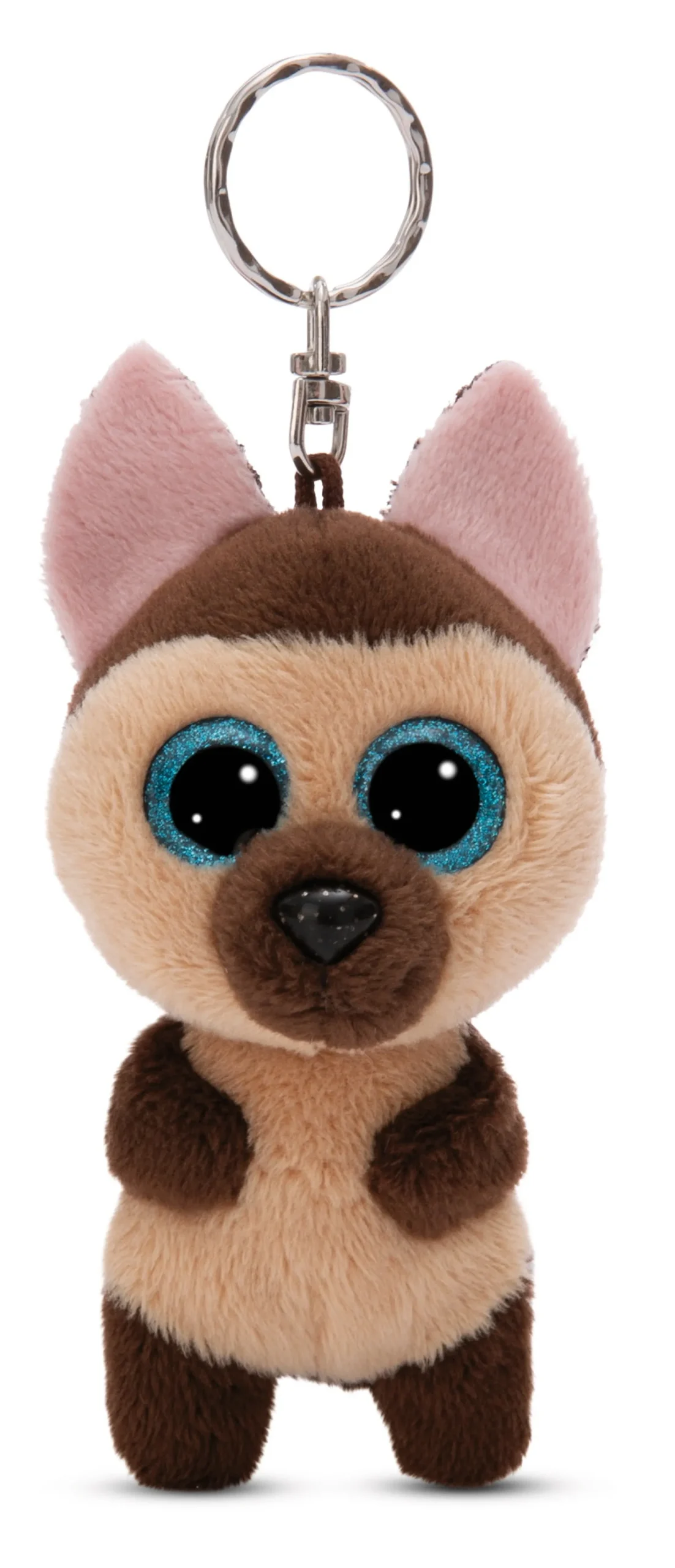 The 9cm brown GLUBSCHIS shepherd dog Detleff is swinging watchfully on your keys, backpack or school bag. The handsome shepherd dog with the blue glitter eyes is made of fluffy soft NICI plush and can be attached with the help of a sturdy metal key ring. Whether by day or night – you can always rely on Detleff! (c) 2023 Carletto, licensed by NICI GmbH