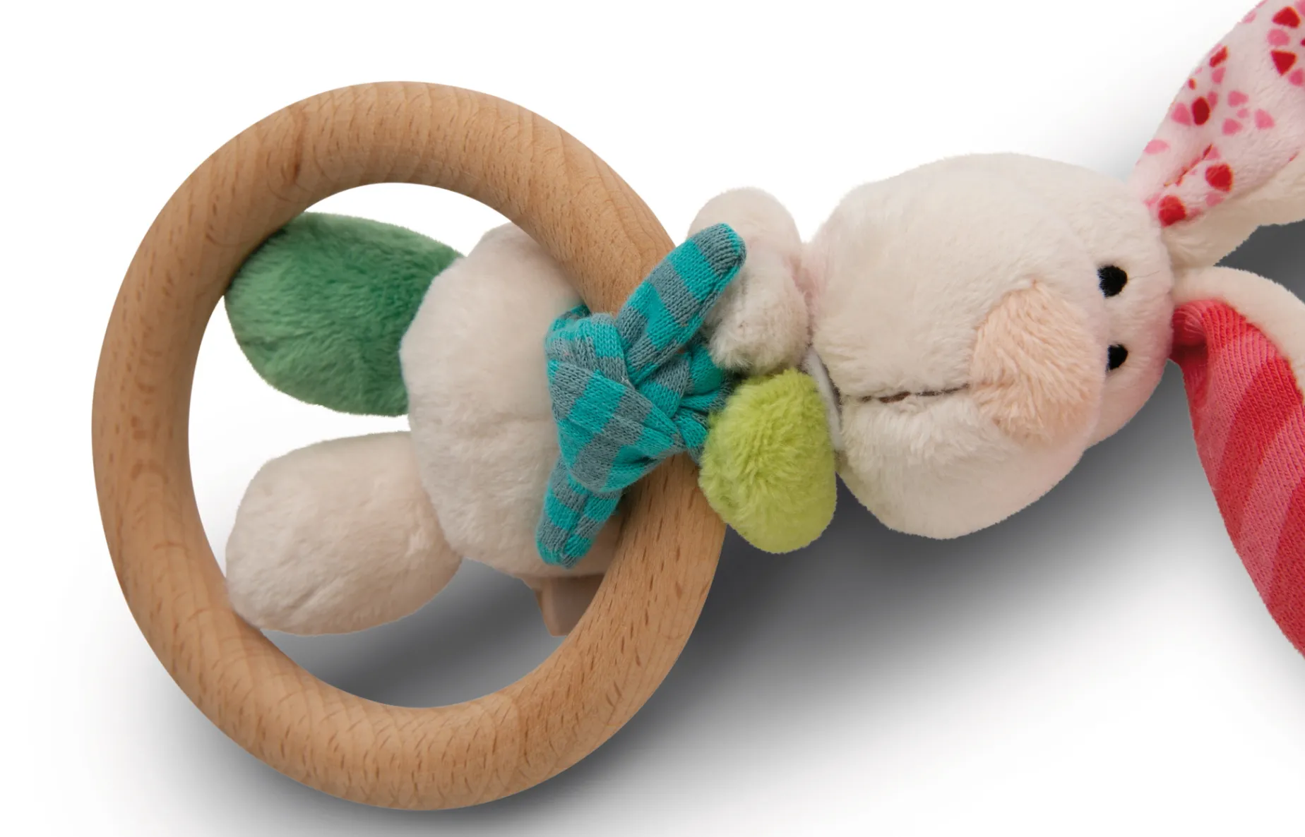 Bunny Tilli is made of soft plush and a great cuddly friend. The colorful NICI animal has a bell in the body that rings softly when moved. In addition, Tilli has a teething ring made of wood with it. The ring is knotted and can be easily removed. Now Tilli can be used as a cuddly toy or invited to a round in the washing machine.
