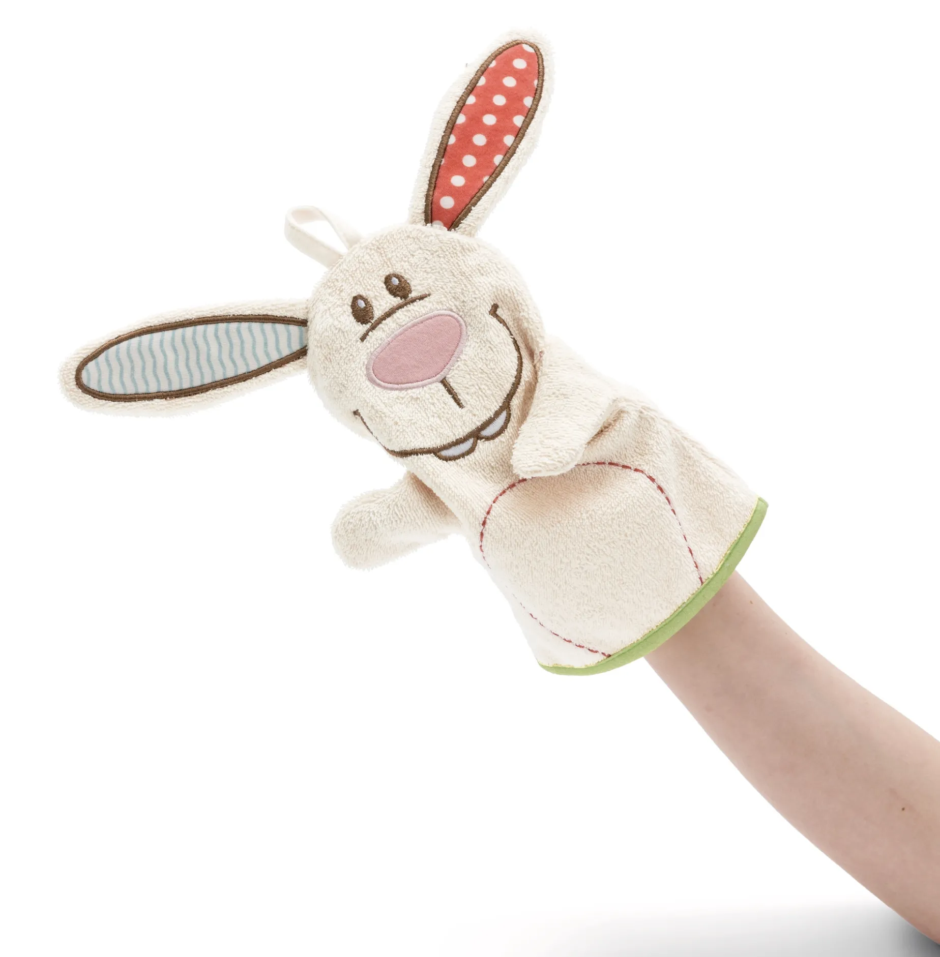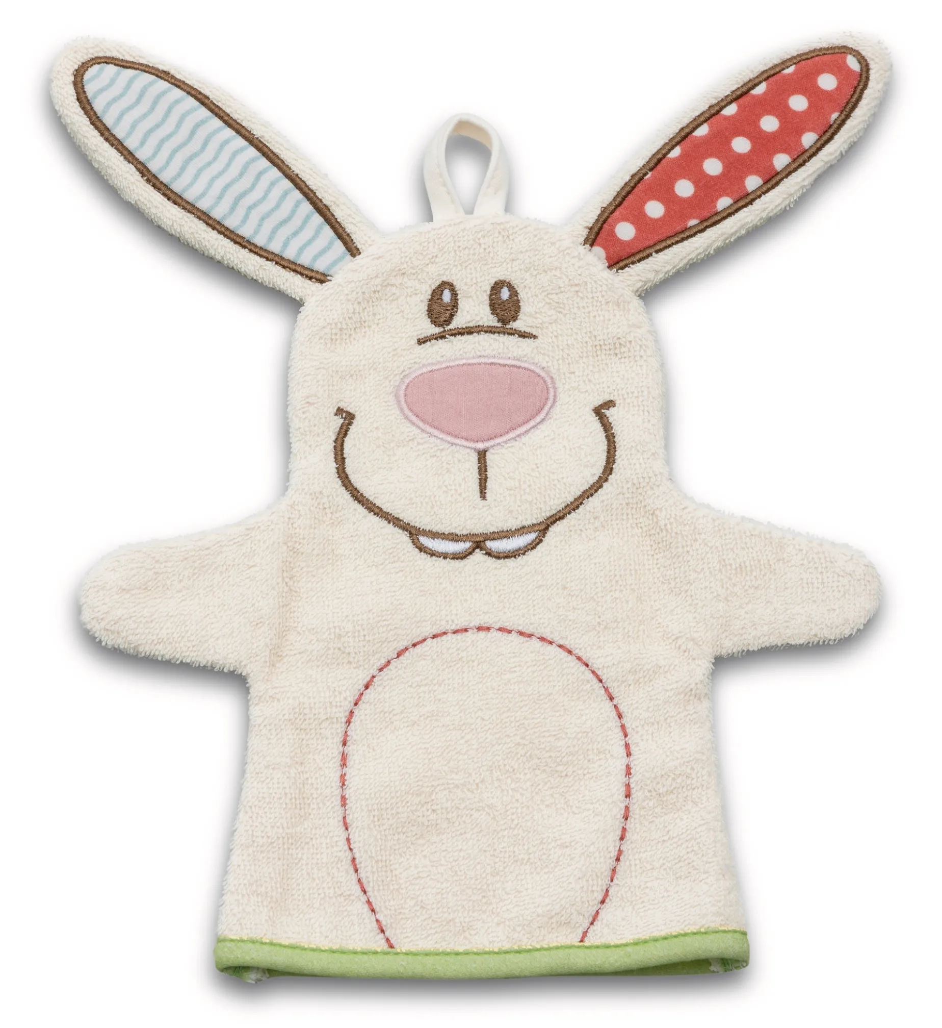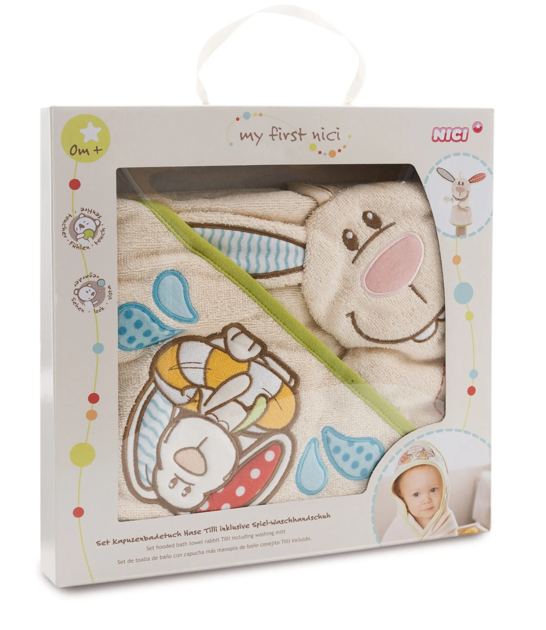 The cuddly MyFirstNICI hooded bath towel, which is available as a set with a soft, figurative play wash mitt, is perfect for baby’s first set. The enchanting gift packaging makes the high-quality towel with wash mitt a unique gift for new parents. The fluffy baby bath towel made of terry cotton with a practical hood and cute rabbit Tilli appliqué is ideal for wrapping up, drying off or as a carpet pad for the little ones and invites to cuddle up after a bath. Thanks to the cheerful colors and the cute bunny on the hood, the high-quality terry cotton towel will quickly become a favorite. The adorable play wash mitt in the shape of the cute bunny Tillis is a fun and practical accessory for bathing and washing your little one. The wash glove is not only gentle on baby’s skin, but also invites for playing as a hand puppet after the bath. This makes bathing and washing twice as much fun.