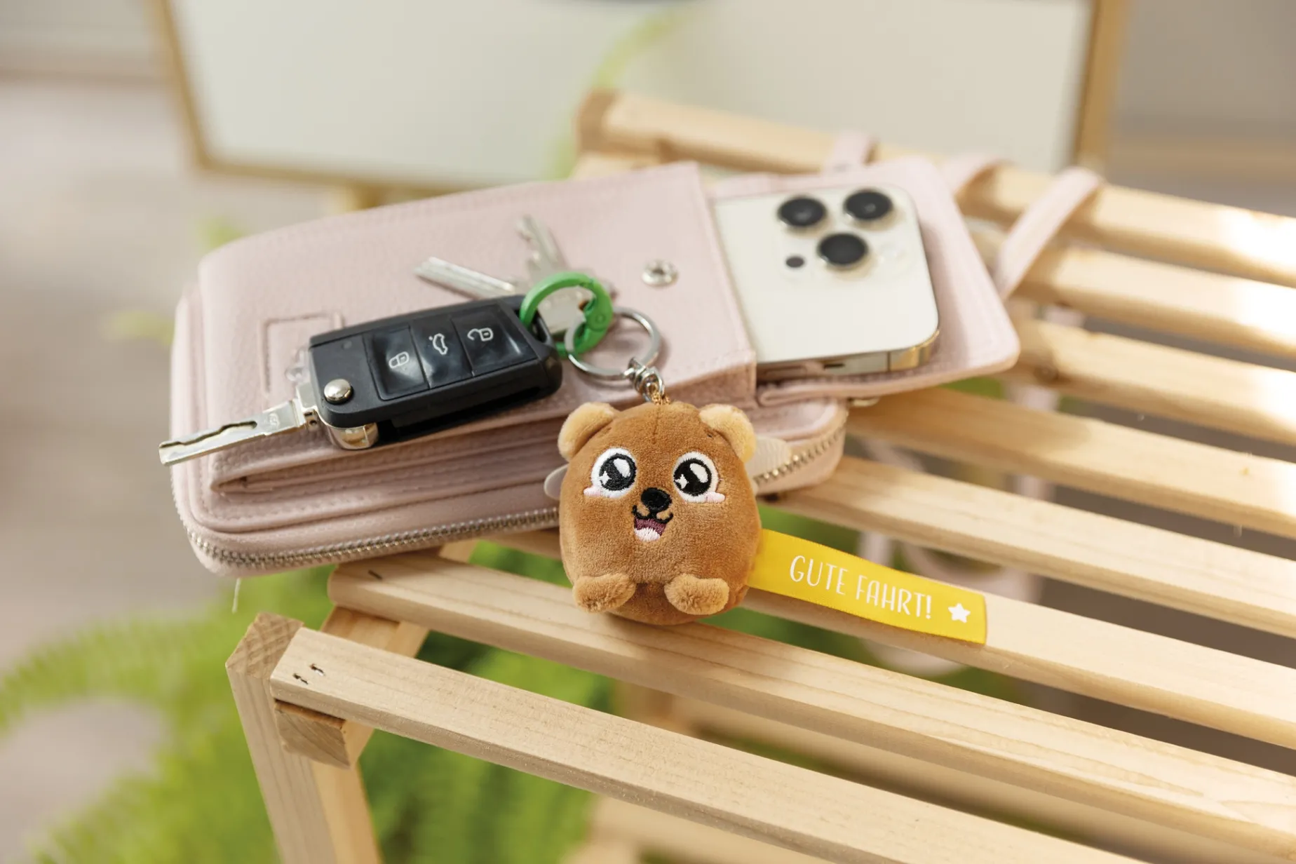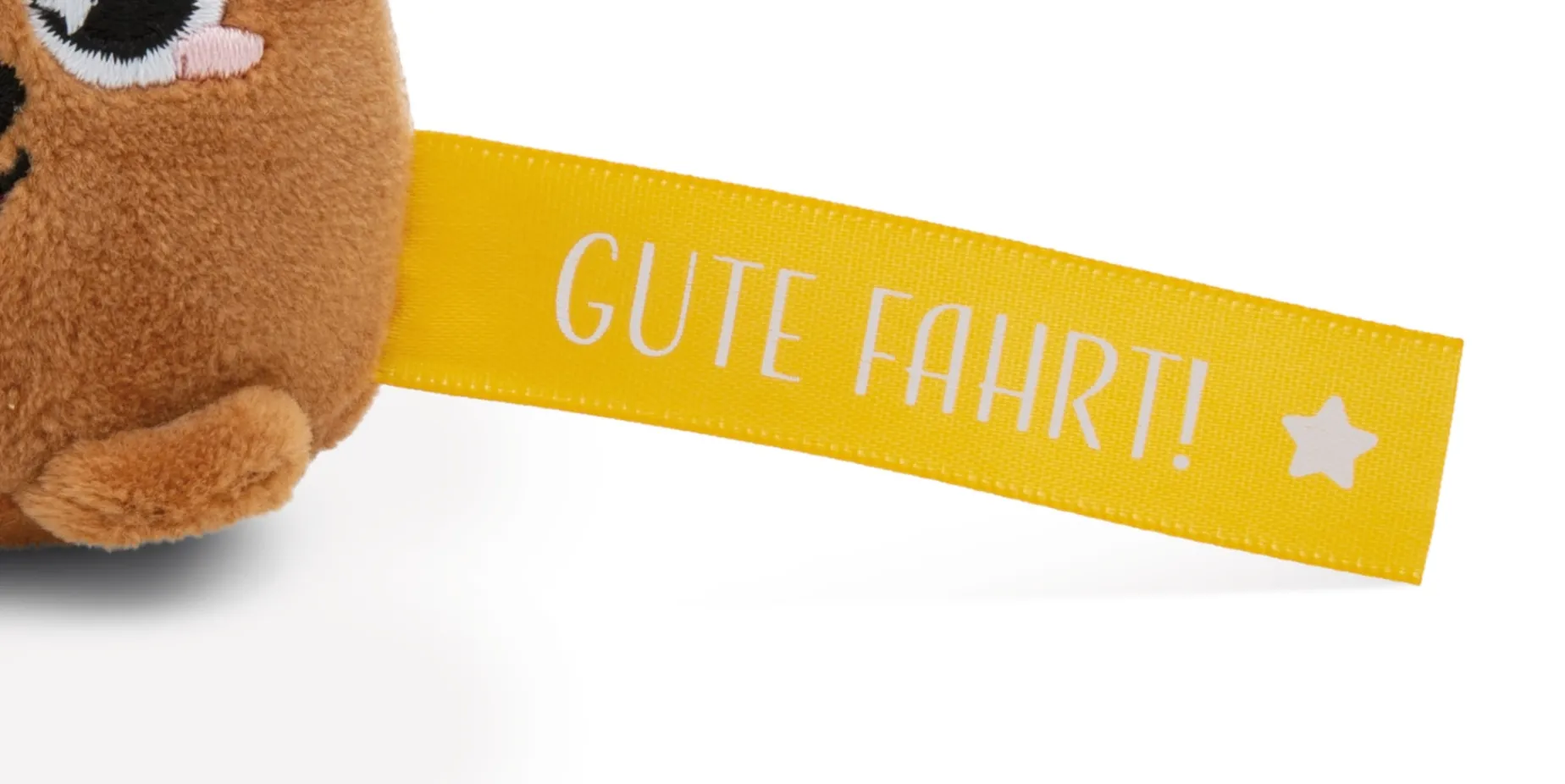 The cute, brown bear made of cuddly soft NICI plush enchants young and old with its little guardian angel wings and big eyes. A sturdy metal key ring is attached to his head, which ensures that keys are held together and the little NICI plush bear will render a very special touch to backpacks, bags or school satchels. Whether for a birthday, as a lucky charm or as a sweet little present – the NICI keyholder bear with its yellow banner saying ‘Gute Fahrt!’ is always a great gift idea, even for passing the driving licence, a new car or prior to a long journey.