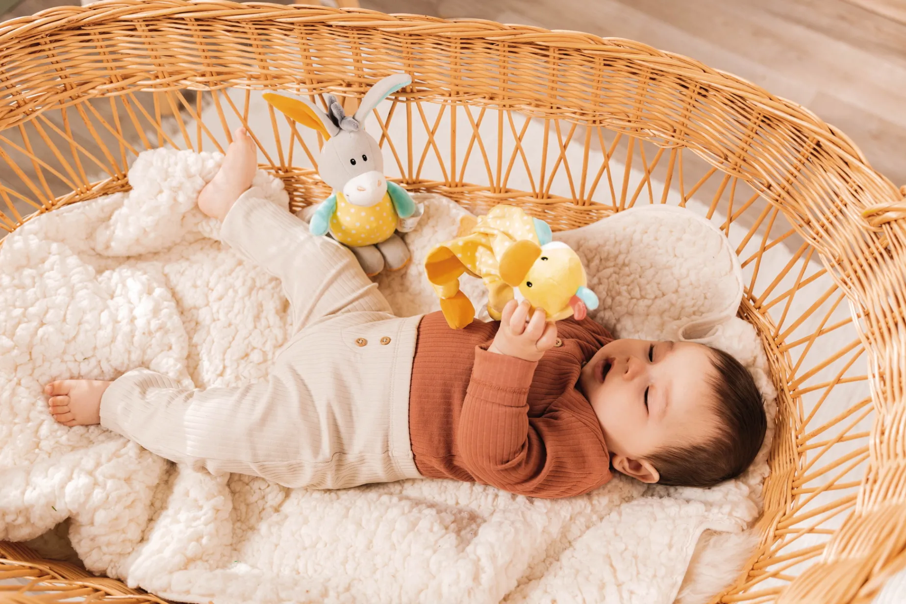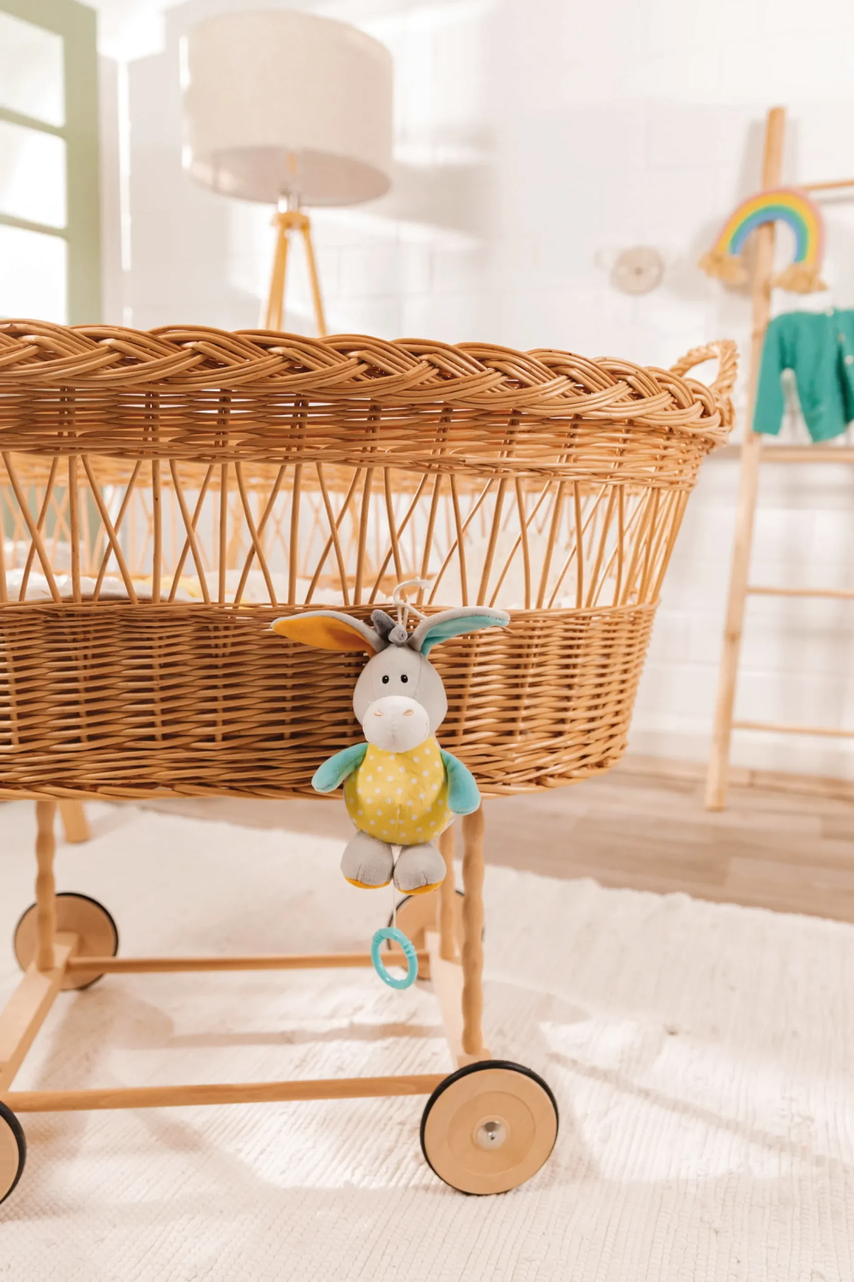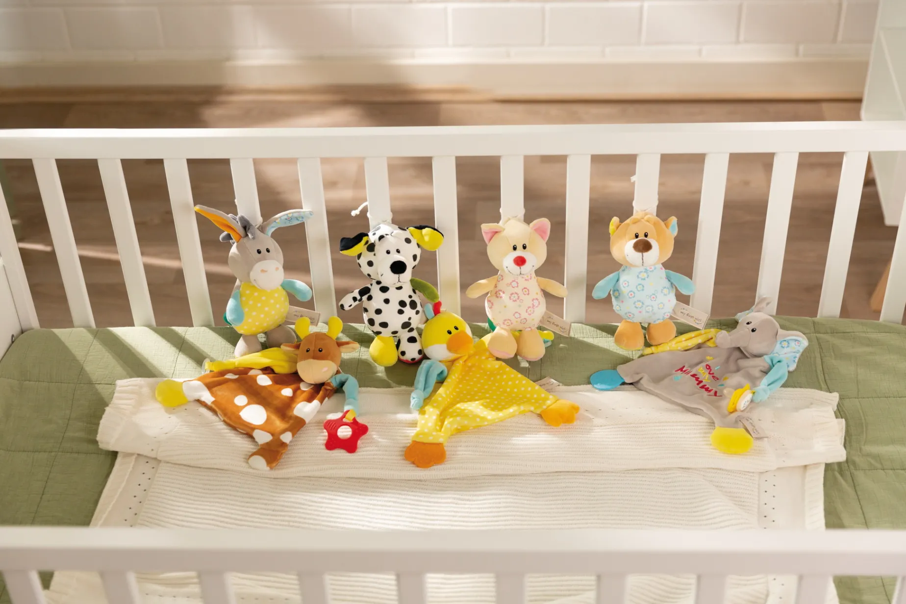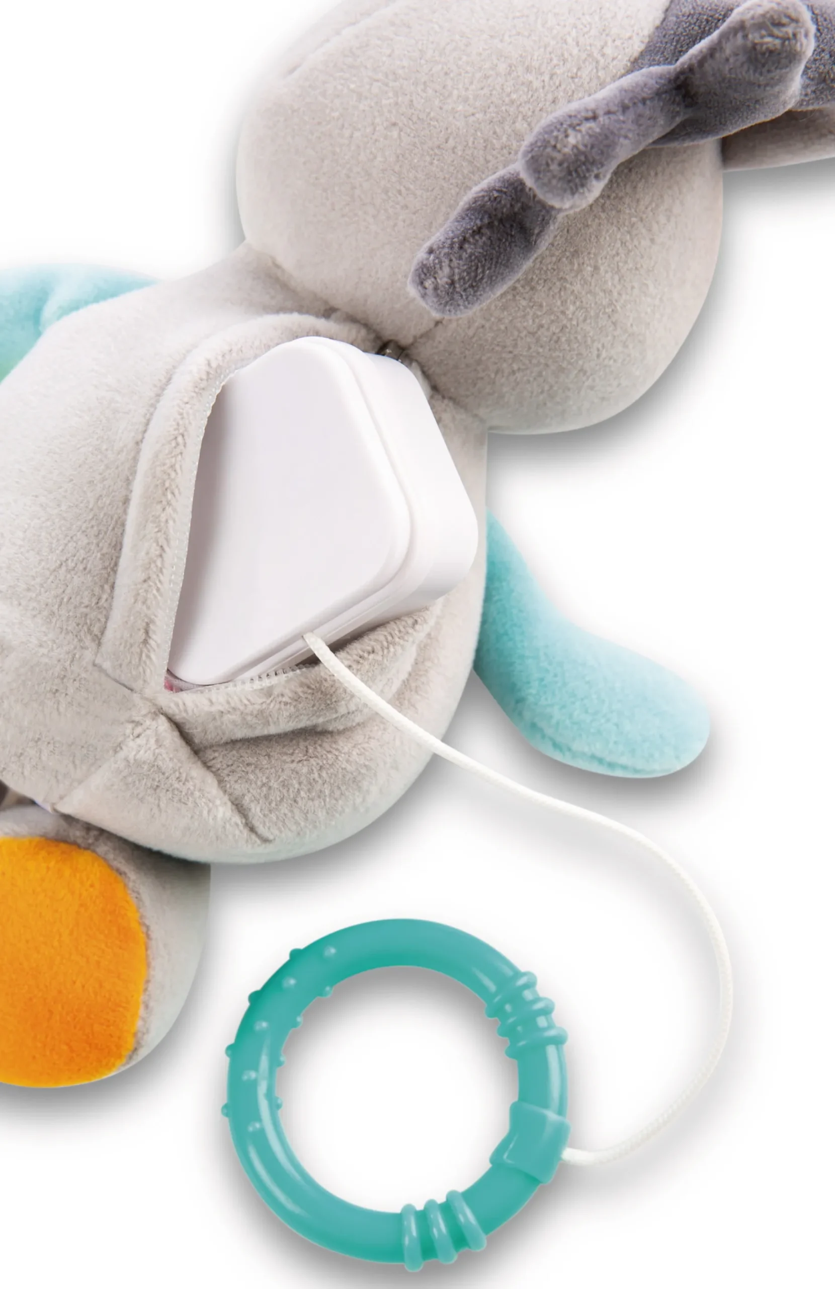 The cuddly soft music box in the shape of a cute gray donkey in a yellow and white dotted pajamas with different colored ears and arms is a perfect gift for welcoming a new baby or a christening. By pulling the small ring, which is attached to the softly plush body of the 18 cm dog with a string, the integrated music box starts playing and baby is accompanied into the land of dreams with the melody of Mozart´s’ lullaby. Thanks to two ribbons, the cuddly toy & music box can be easily attached to the bed, stroller or infant car seat. The music box cat of the MyFirstNICI collection is a great bedtime assistant and at the same time even stimulates motor and sensory skills of babies.