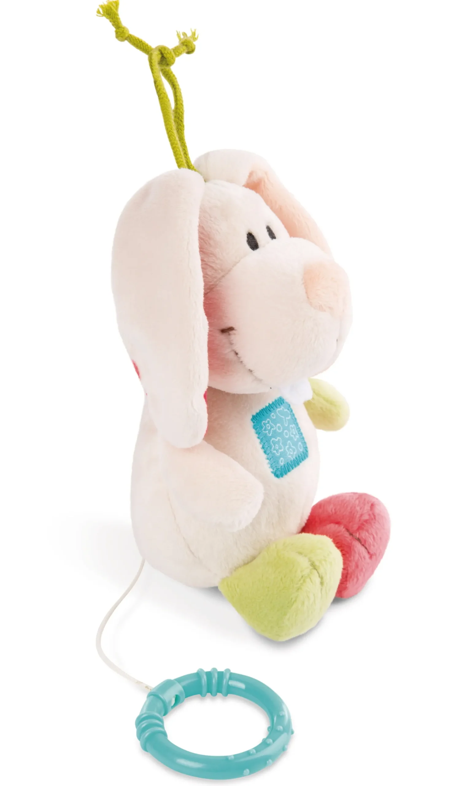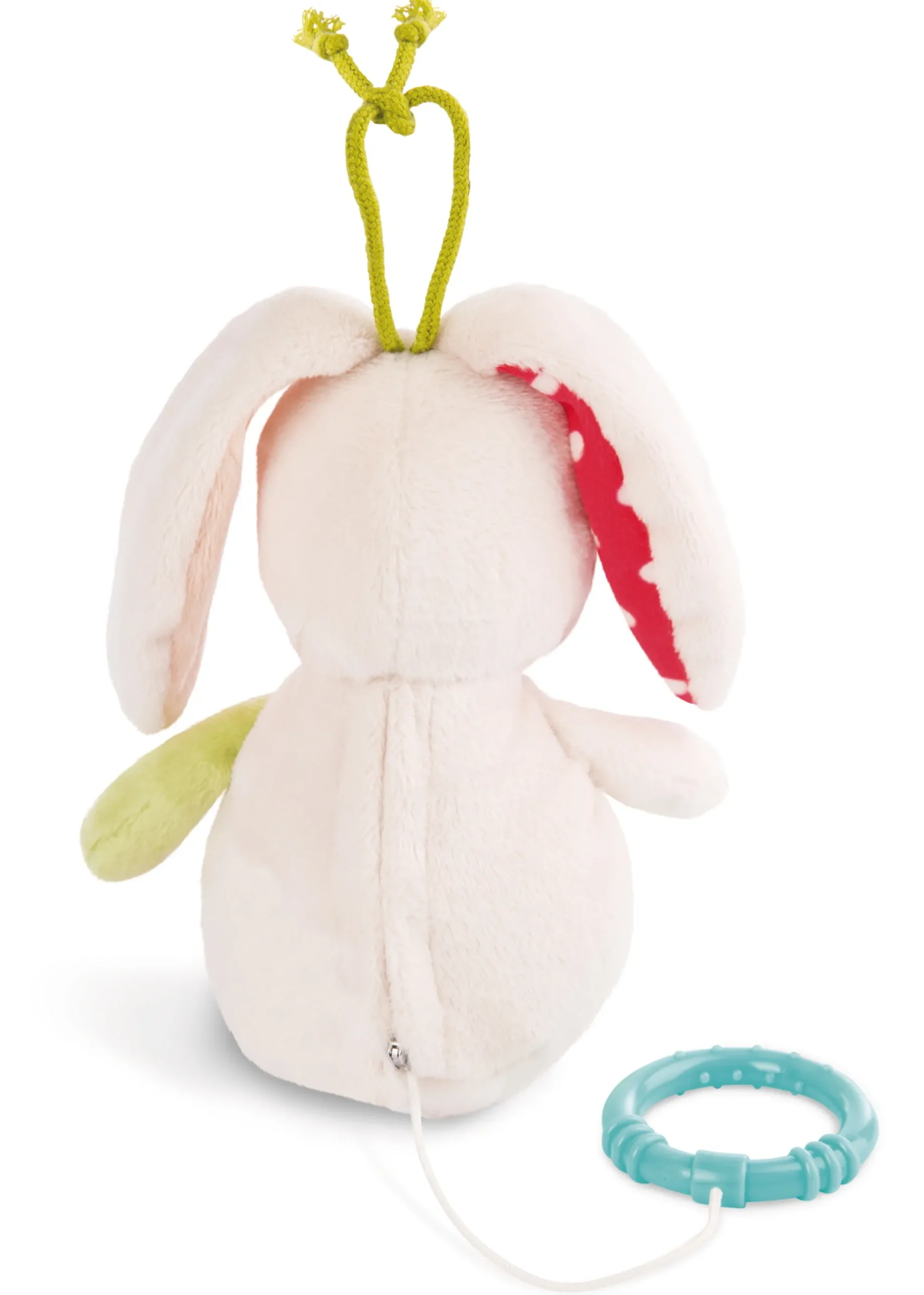 The perfect companion for every baby: Tilli the rabbit as a cuddly plush music box! With the gentle sound of Schubert’s lullaby, which plays when the musical mechanism is manually wound, Tilli creates a calming atmosphere and sweet dreams. But Tilli the rabbit with his long floppy ears and cute little rabbit teeth is more than just a music box – he is also a loyal cuddly friend who invites you to cuddle and play. Thanks to the practical cords on his head, he can easily be hung on the crib or baby car seat so that your little darling can always keep a loving eye on him. His super cute design makes Tilli irresistible and best of all: the musical mechanism can be easily removed so that Tilli can simply be washed. With rabbit Tilli, you are giving a friend for life!