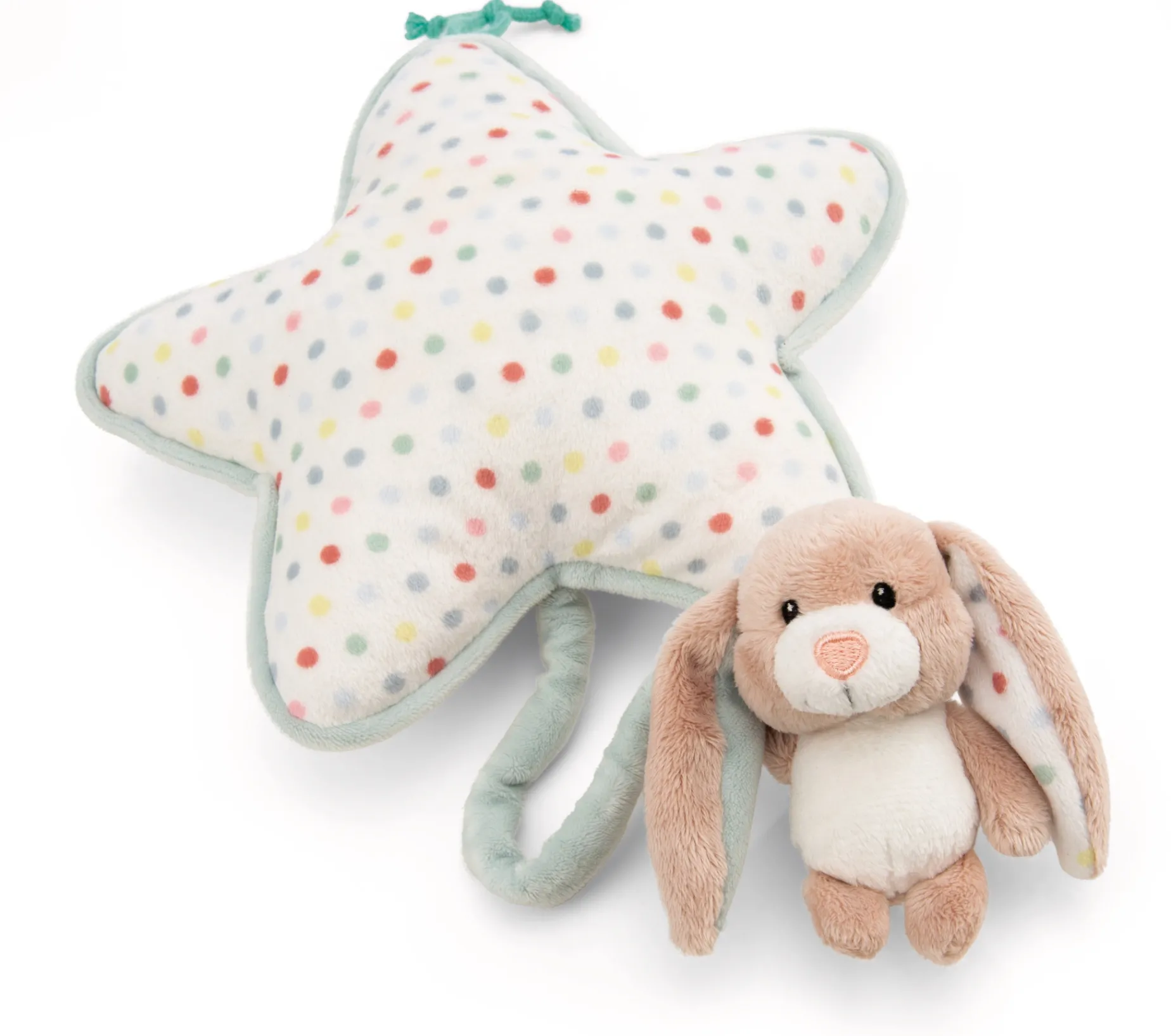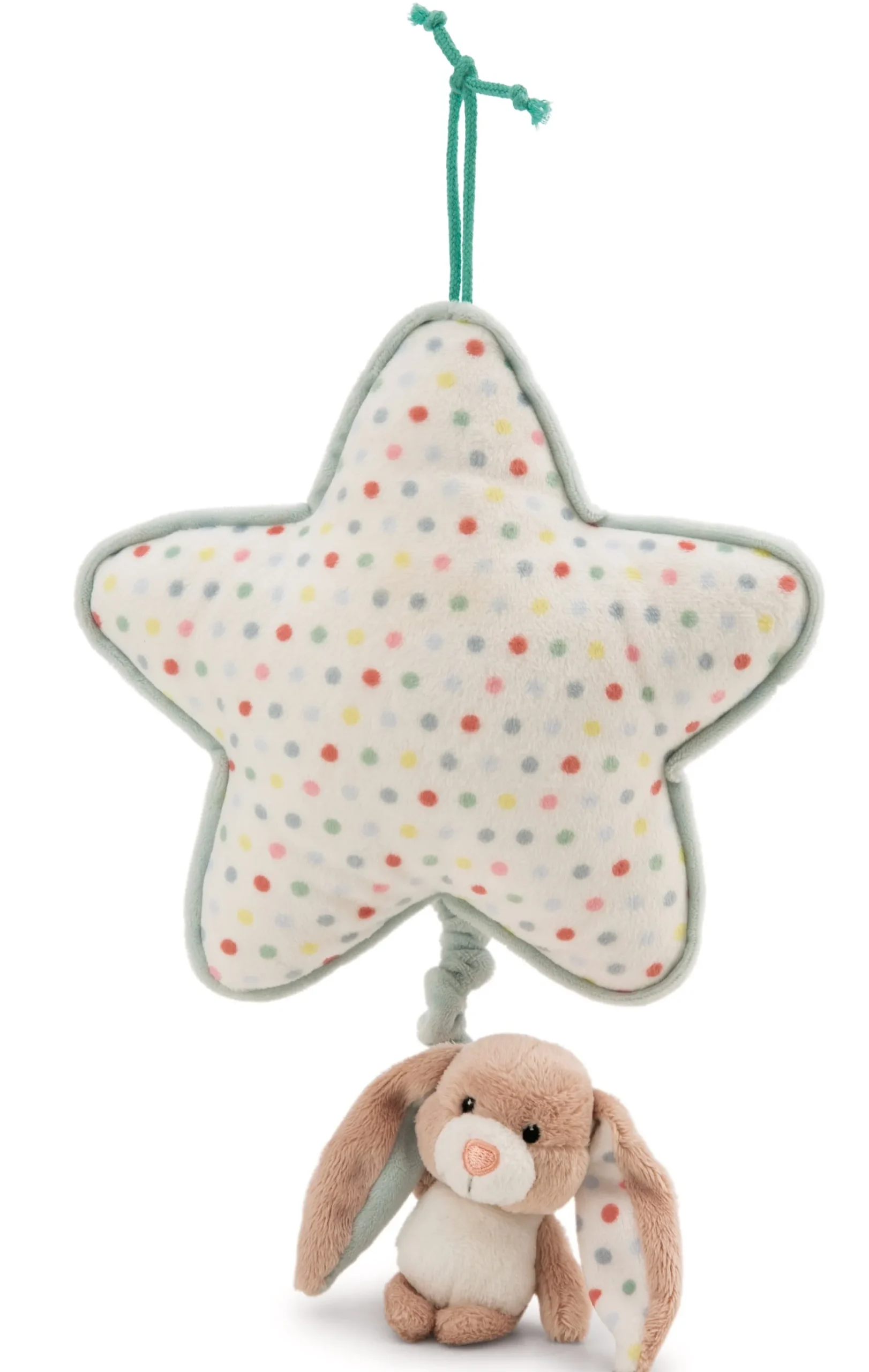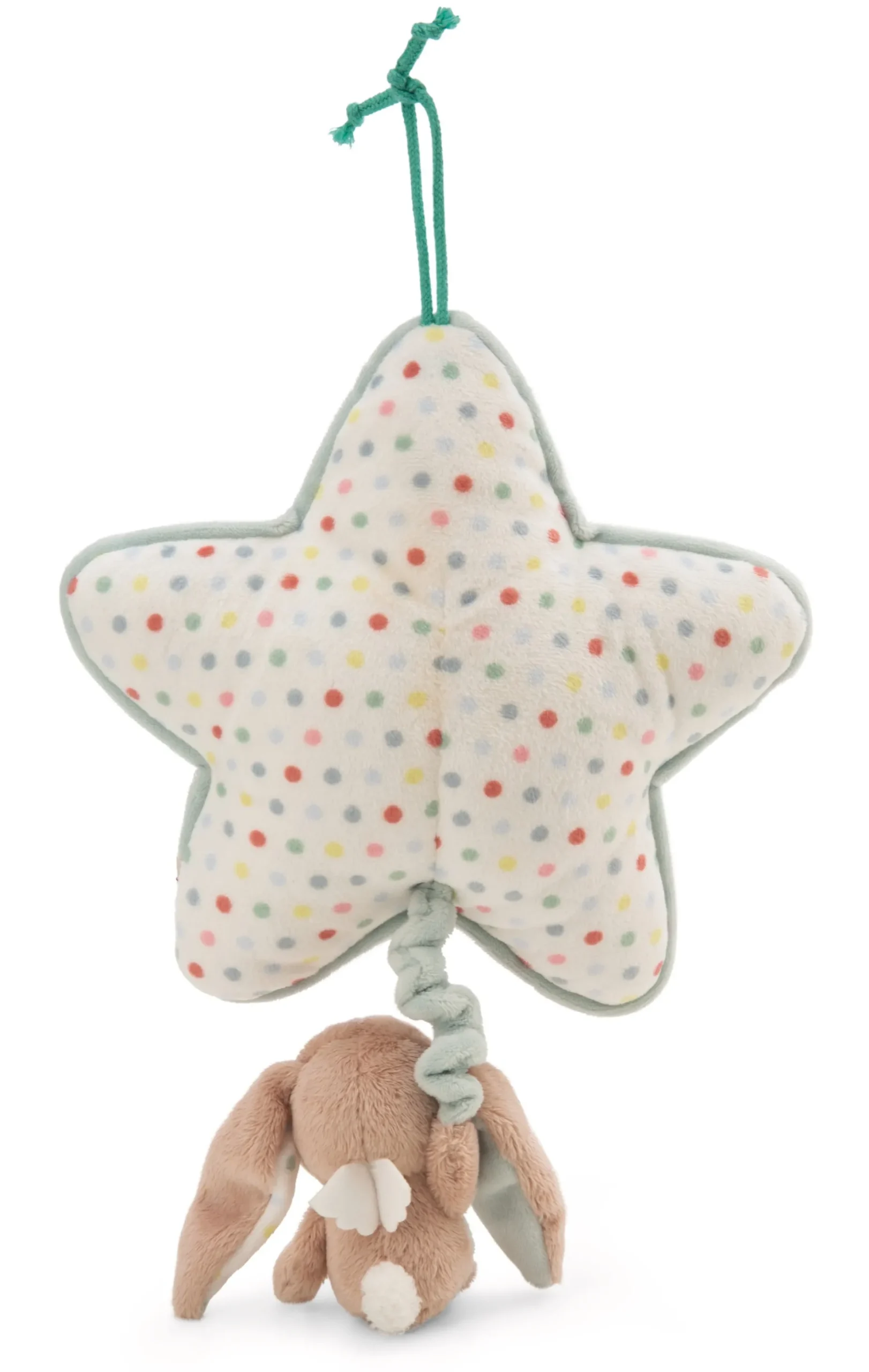 The enchanting star-shaped music box is not only a beautiful decorative accessory for the baby’s room, but also provides a soothing melody for your little miracle. Made of cuddly soft plush material, the star with its lovely, pastel-colored polka dot pattern invites babies to cuddle up and dream. At the end of the star, the cute guardian angel bunny Fjella watches over the baby. With his friendly face and long, fluffy ears, Fjella conveys a sense of security and comfort. The mechanical music box plays the well-known children’s melody “Do you know how many little stars”, which floats gently through the room and creates a calming atmosphere. This melody is ideal for lulling your child to sleep or helping your baby to relax. Another practical feature of this music box is that it is washable. Two cords at top of the star make it easy to attach to the crib, playpen or infant carrier – so the music box can be taken anywhere. The music box is a lovely gift for a birth or christening. It combines functionality with an enchanting design and is sure to quickly become a favorite of the baby receiving the gift!