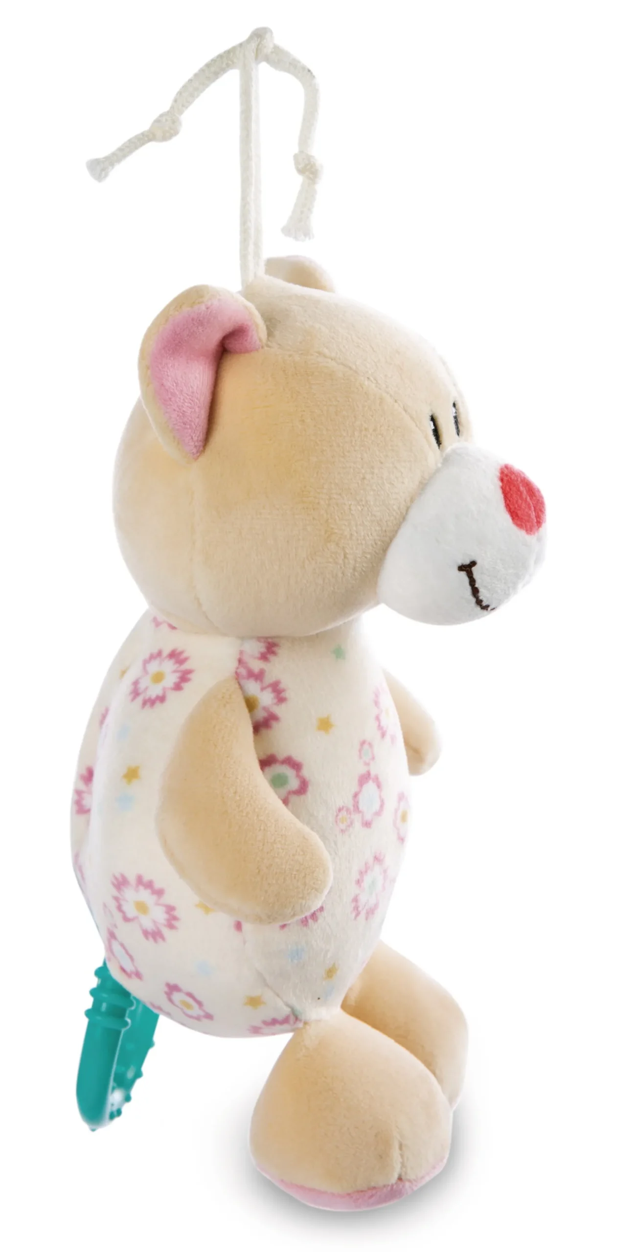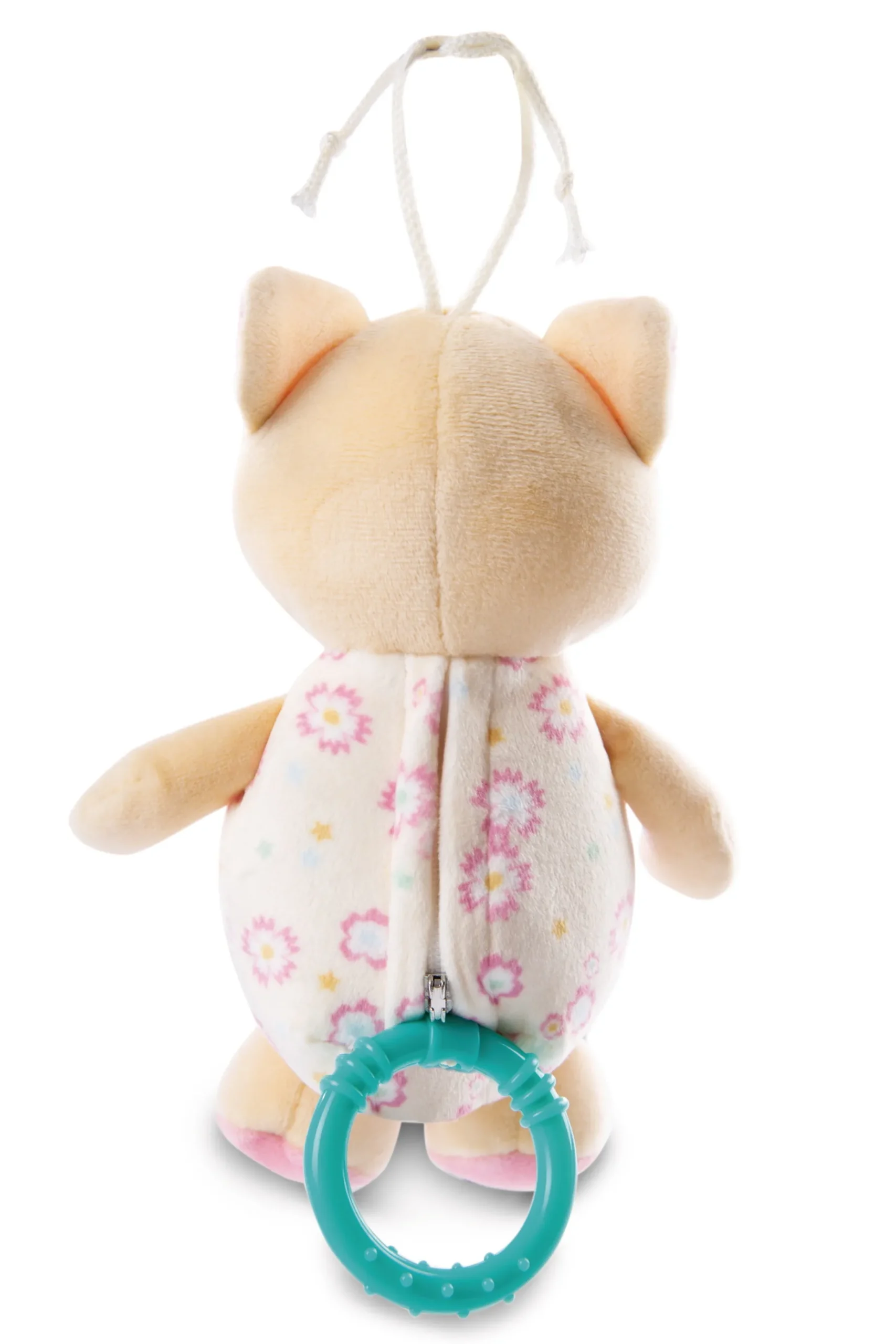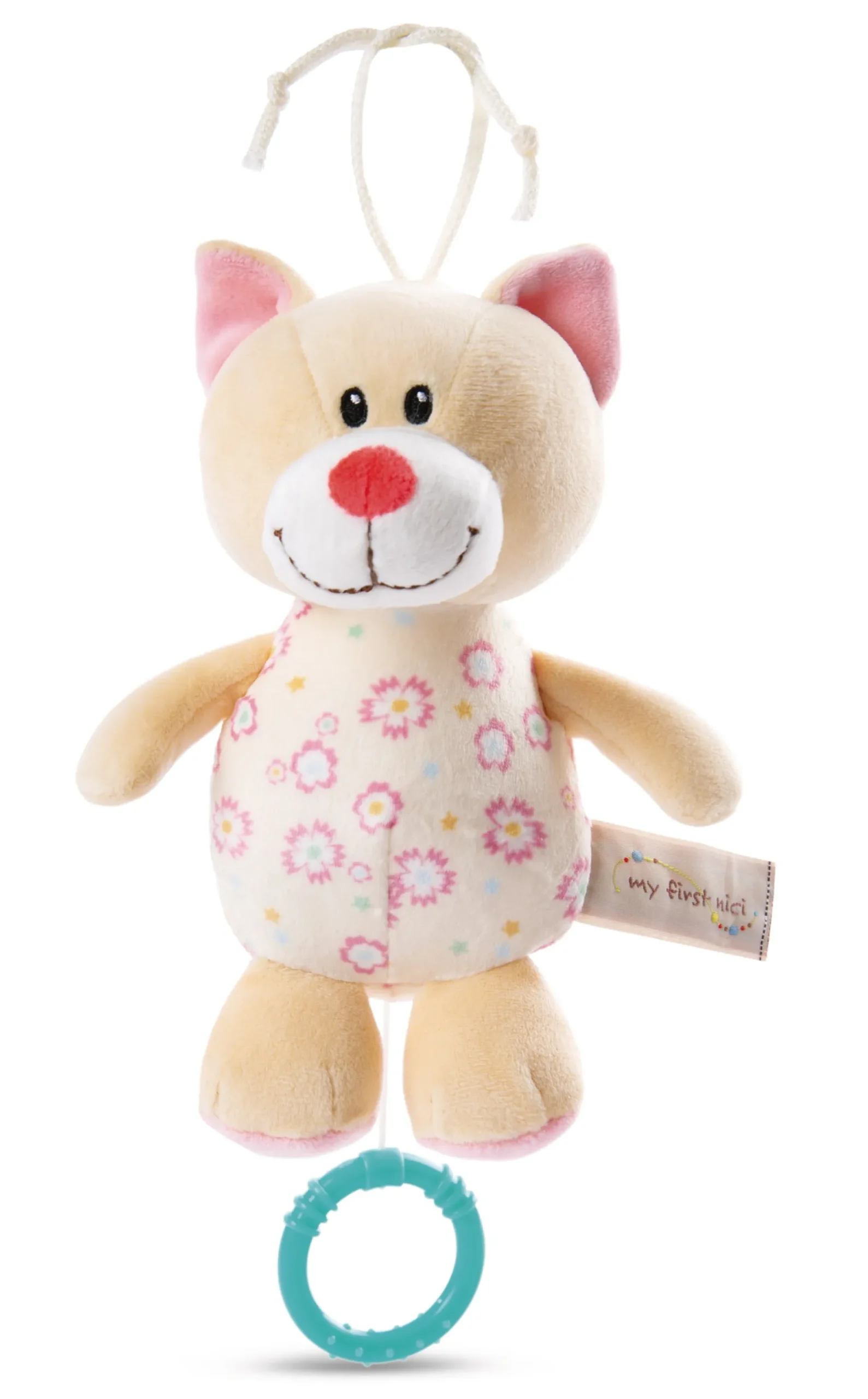 The cuddly soft music box in the shape of an adorable little cat wearing a pink pajama is a perfect gift for welcoming a new baby or a christening. By pulling the small ring, which is attached to the softly plush body of the 18 cm kitten with a string, the integrated music box starts playing and baby is accompanied into the land of dreams with the melody “Weißt du, wie viel Sternlein stehen” (“Do you know how many little stars”). Thanks to two ribbons, the cuddly toy & music box can be easily attached to the bed, stroller or infant car seat. The music box cat of the MyFirstNICI collection is a great bedtime assistant and at the same time even stimulates motor and sensory skills of babies.