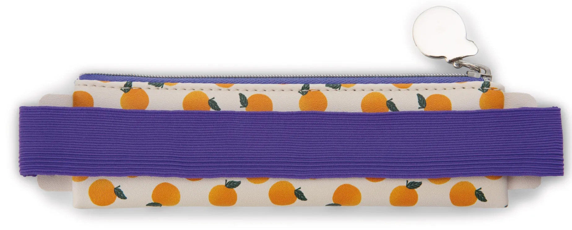 The flat pencil case made of durable PU material is equally suitable for school, work or the purse, e.g. as a pouch for pens, cosmetics or small stuff. With the help of the broad elastic band, it can be securely attached to any DIN A5 pad and the metal charm pendant makes it easy to open and close the zipper. The front of the pencil case shows a capybara bathing with an orange on its head and the words “Happybara”.