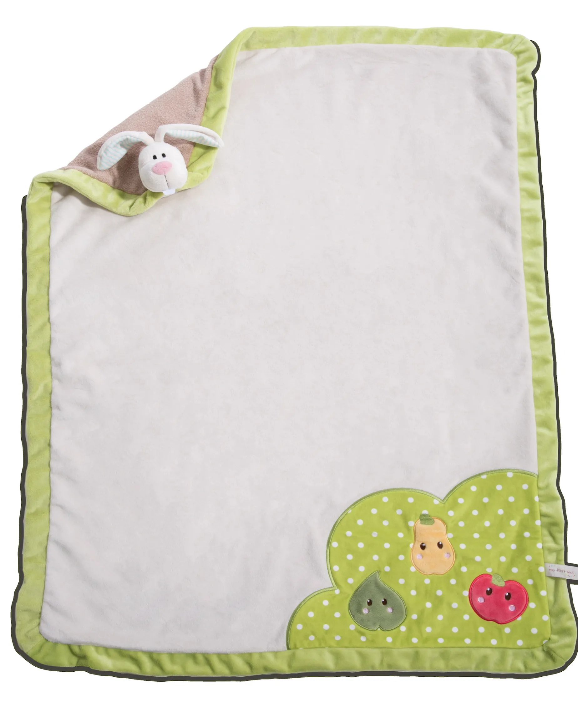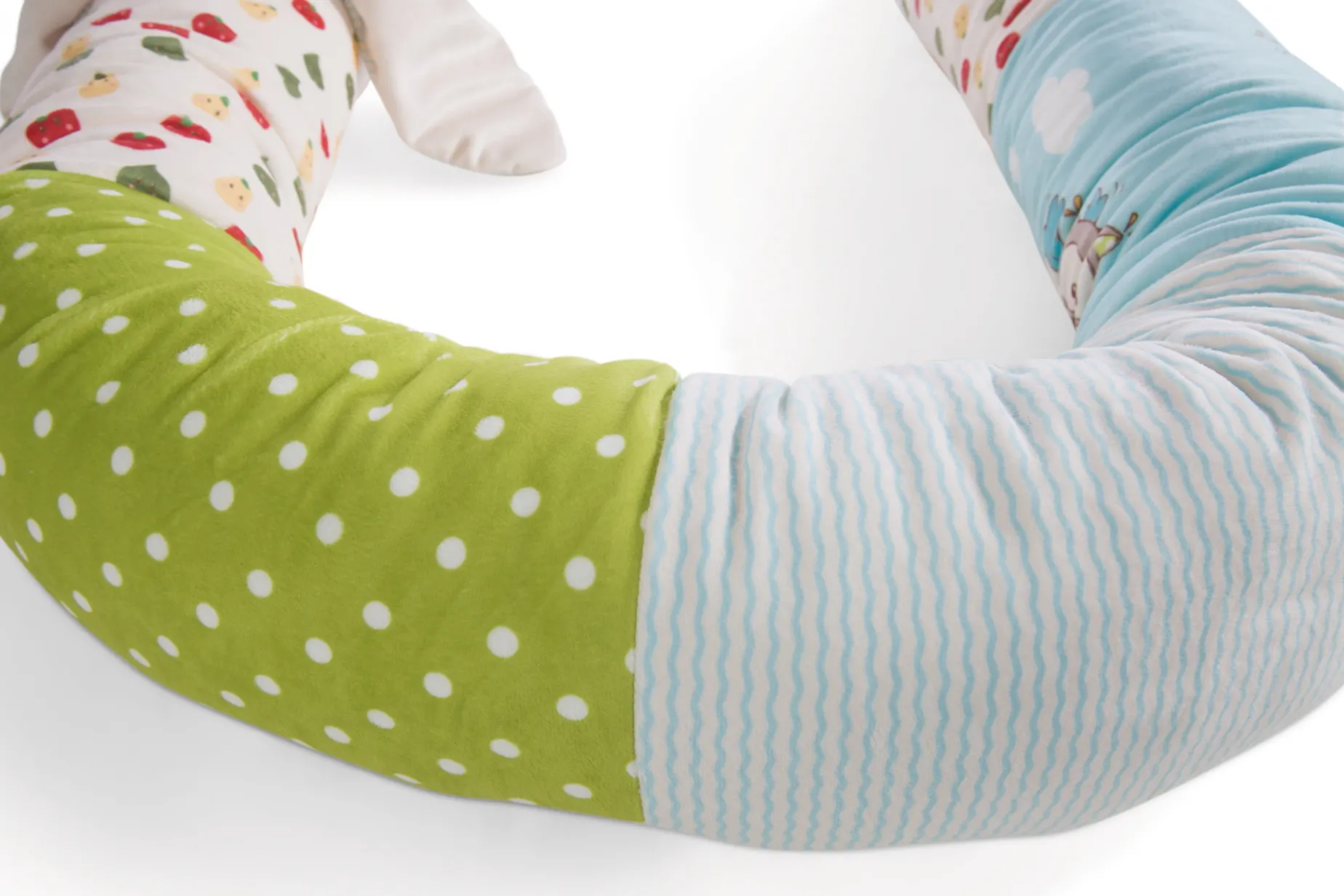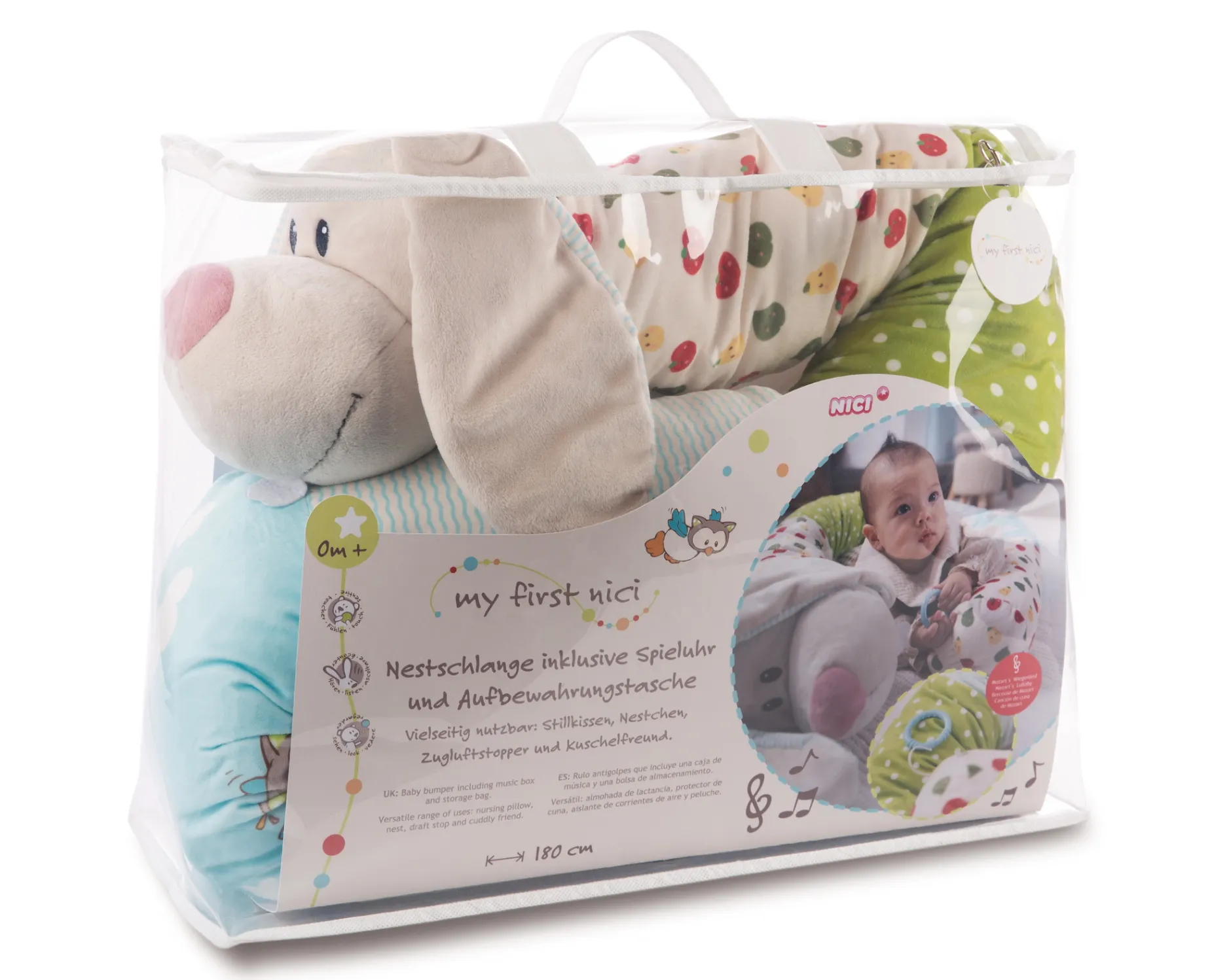 The baby bumper with a length of 180cm made of fluffy soft plush material and filling is cuddly and smooth and gives baby a sense of security. It also offers baby protection in the cot, on the play blanket or in the playpen, as it not only protects the edges and stops drafts, but also ensures that baby does not bump his head. The cute bunny head with long floppy ears and a friendly face will quickly become baby’s favourite. The varied design in enchanting pastel colours and the integrated (removable) music box that plays Mozart’s Lullaby make the soft baby bumper a valuable gift for birth or christening. A practical carrier bag and a matching gift tag are part of the gift set.