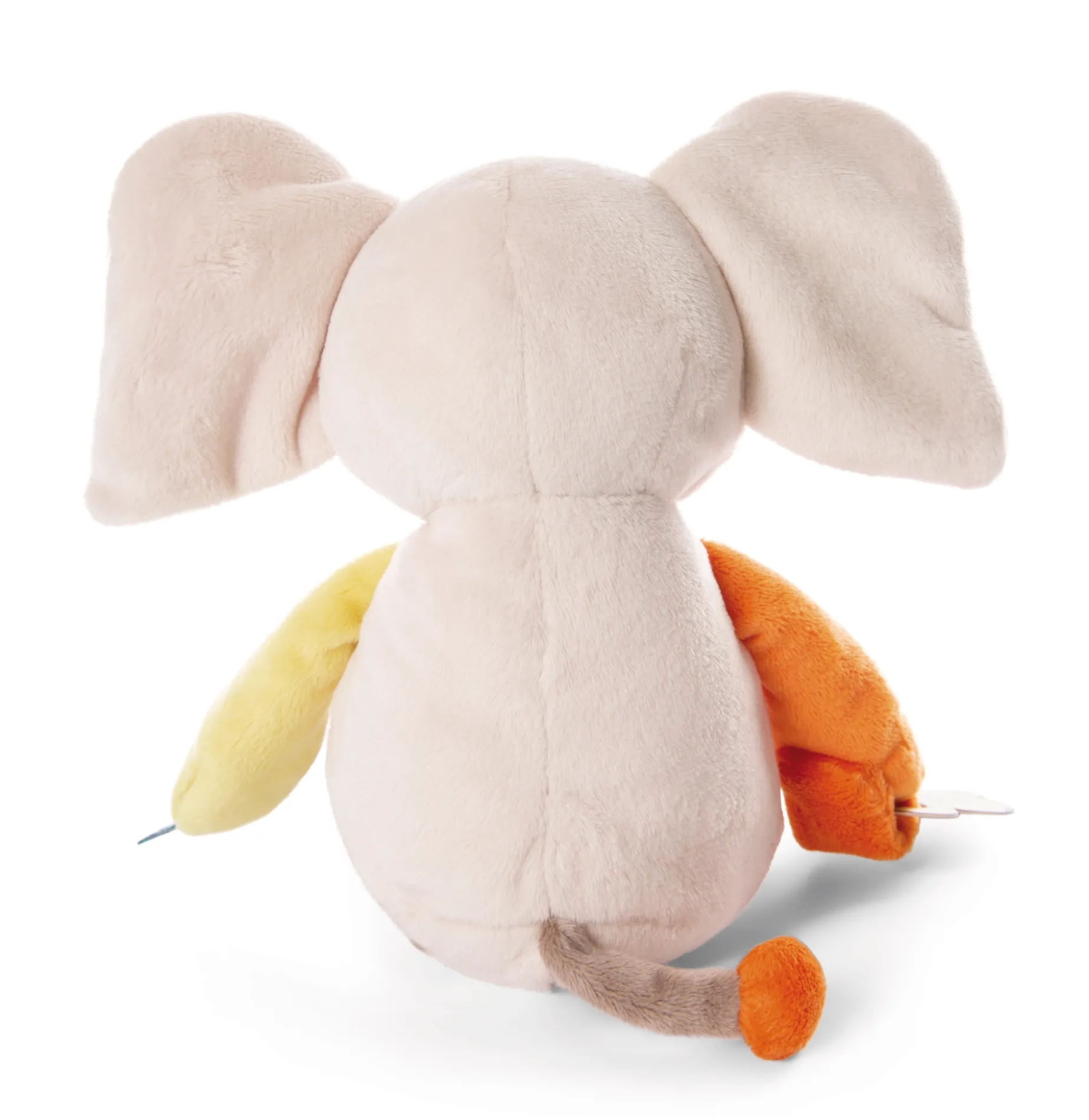 Elephant Dundi is a cuddly toy and playmate: crackling paper rustles in the green ear and there is a squeaker in the checkered ear. The long elephant trunk is elastic. The right foot is a rattle with a mirror and colorful balls. The dummy can be attached to Dundi’s orange arm with Velcro. With Dundi, babies from the age of 3 months have a reliable companion by their side with whom there is always something new to discover and who playfully promotes tactile, visual and auditory skills.