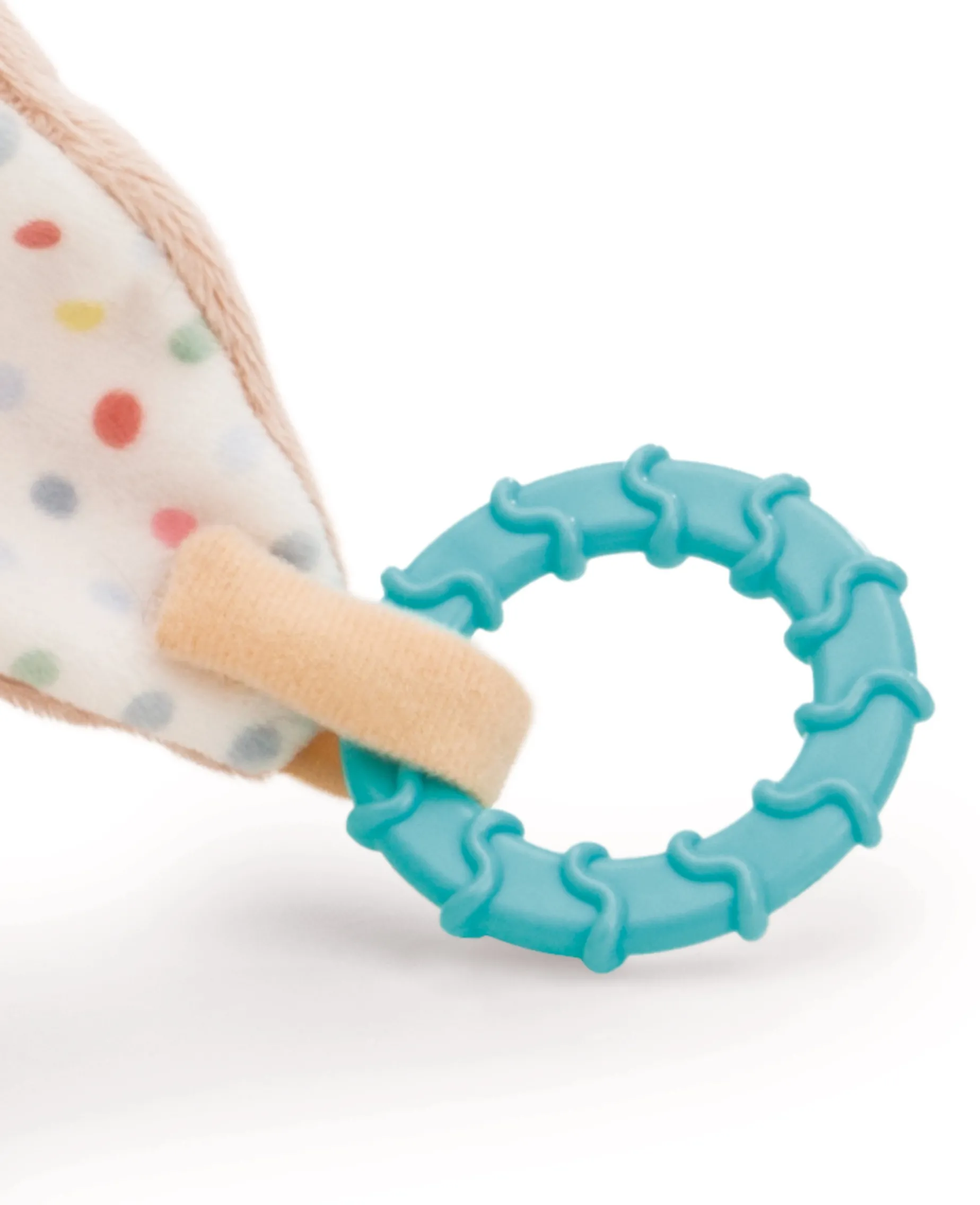 Guardian angel bunny Fjella is not only an adorable soft toy, but also an exciting activity toy that awakens every baby’s curiosity and urge to explore. With its light brown and beige plush fur and long floppy ears, Fjella is not only suitable for cuddling, but also offers numerous play opportunities that will delight and keep little explorers busy. There is a practical teething ring on the bunny’s left ear, which is ideal for teething babies. It provides relief for sore gums and at the same time provides exciting gripping and chewing experiences. Hidden in the right foot is a rattle with a small mirror and colorful beads that makes cheerful noises and provides visual stimulation when shaken. In the left foot, Fjella has a little bell that makes soft sounds and attracts the baby’s attention. And as if that wasn’t enough, hidden in the right ear, which is embroidered with the words “Ich beschütze dich!”, is rustling paper that makes an exciting sound when touched – ideal for encouraging tactile perception. Guardian angel bunny Fjella is therefore the perfect companion for babies, as it combines cuddling with lots of playtime fun. An ideal gift for a birth or christening that brings joy and supports development.