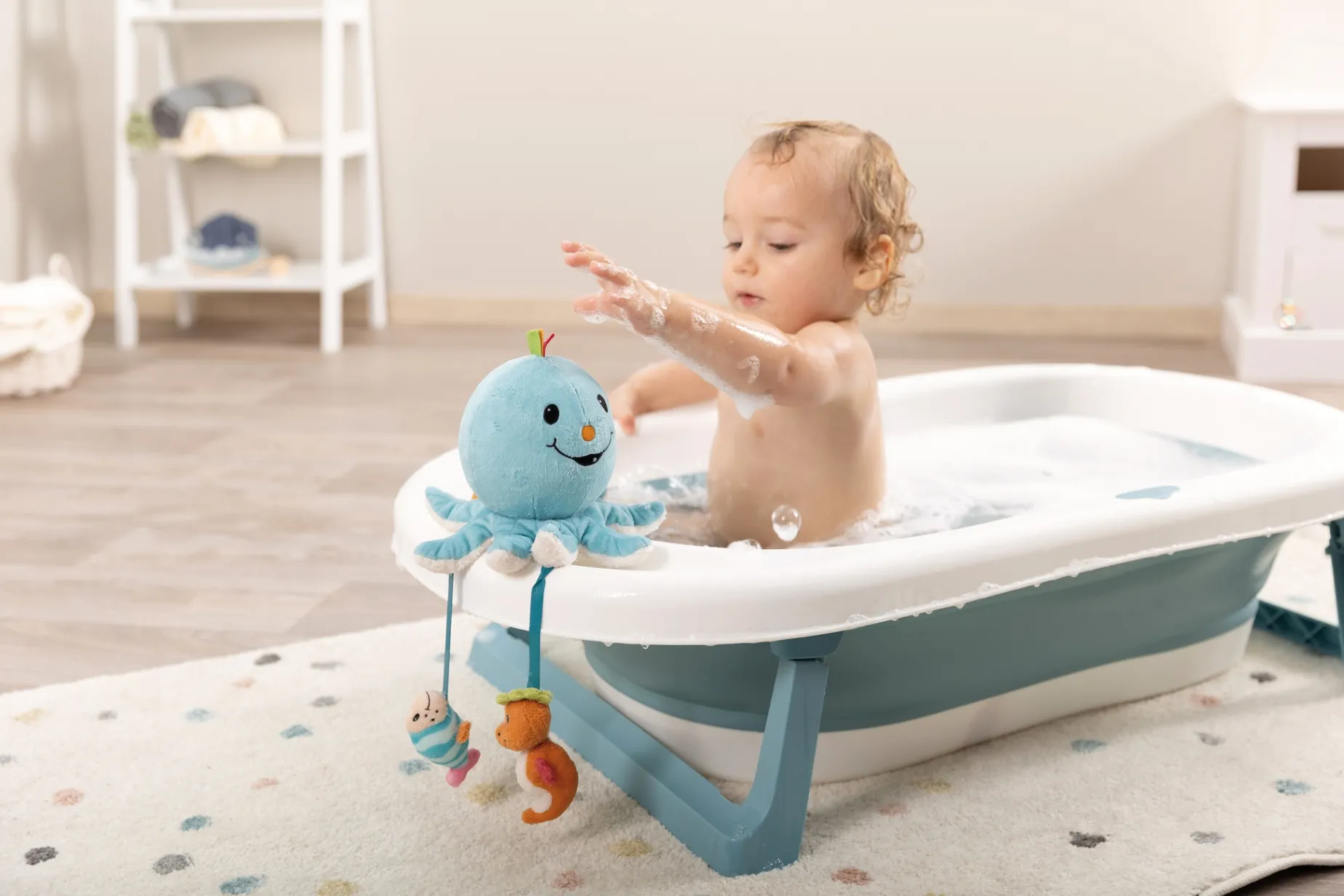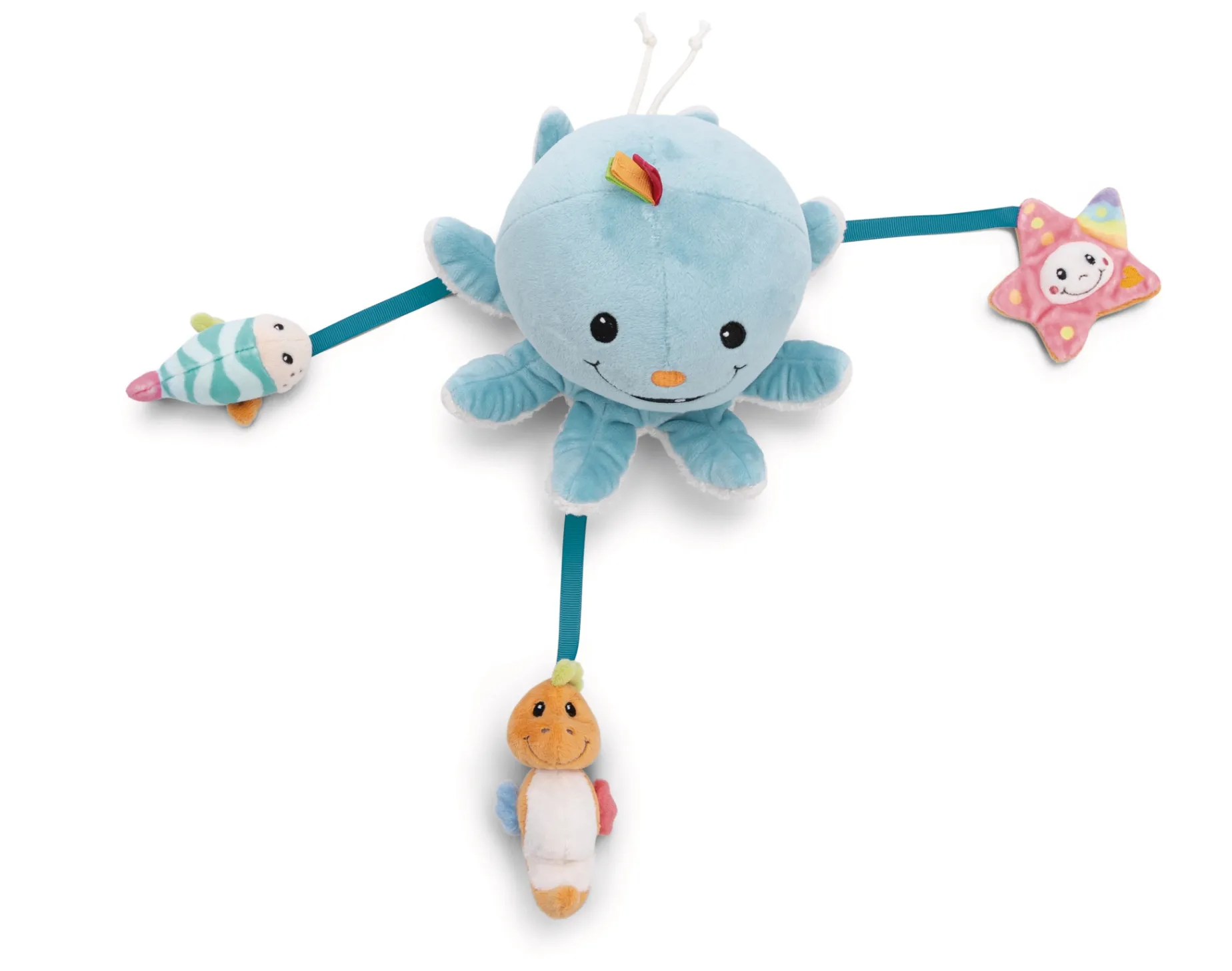 The perfect bath toy not only provides fun in the bathtub, but also diverts your little one’s attention when you are bathing and washing your baby. The cute Octopus Octily from the MyFirstNICI collection is a soft toy for babies that helps develop their motor skills and takes away their fear of water. Thanks to its light filling, the cuddly, light blue octopus with the cheerful face can float on the surface of the water and provides lots of fun and variety in the tub. He only goes underwater when he is full of water. The funny little animal pendants on Octily’s tentacles – starfish, fish and seahorse, which are equipped with crackling foil or rattles – stimulate the sense of touch and hearing and awaken baby’s natural curiosity to discover and play. The cuddly materials of the bathing octopus and his little animal friends are particularly soft on baby’s skin and invite baby to grasp, feel and have fun.