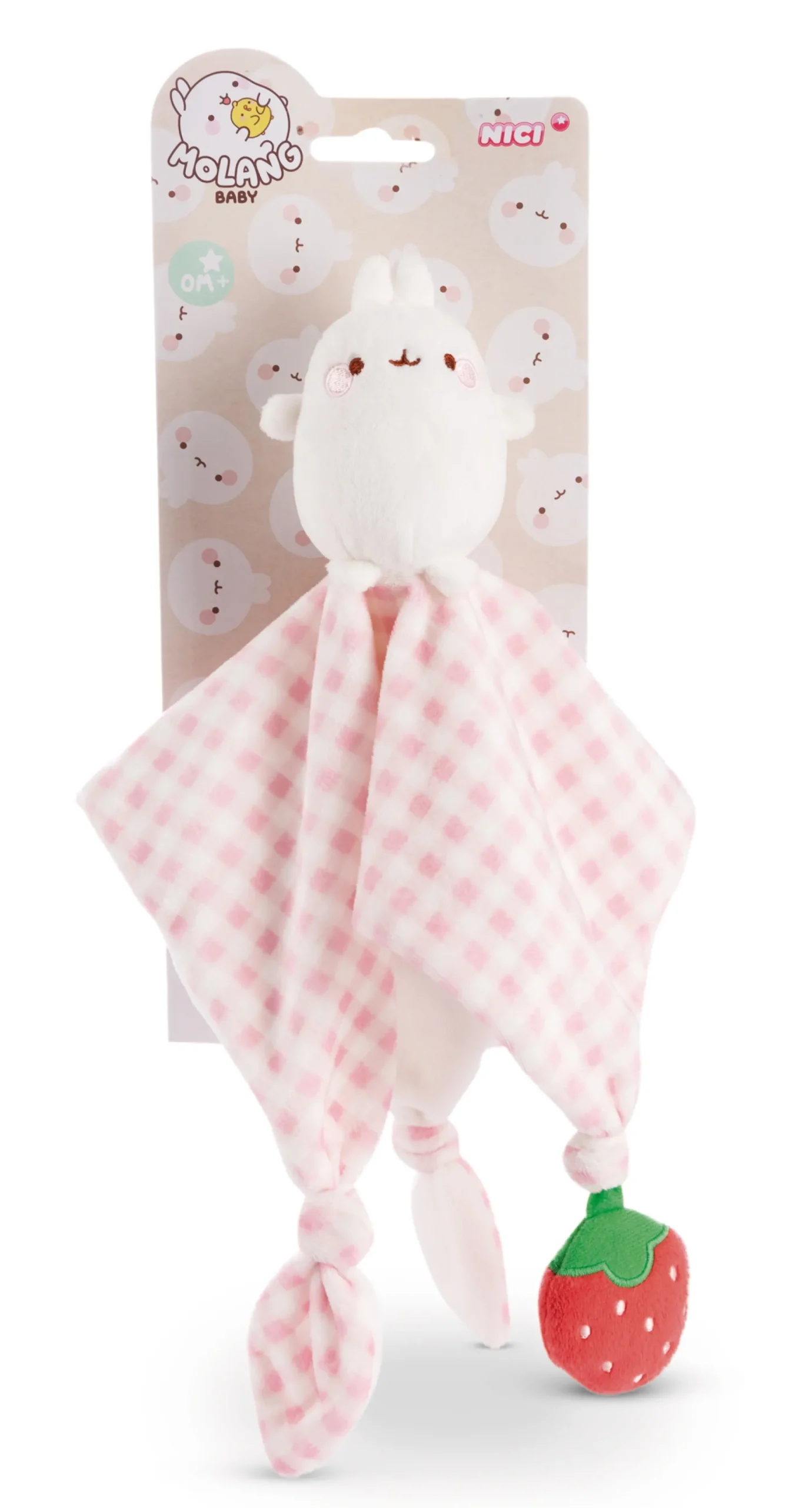 Molang, the lovable character from the same-titled TV series and well-known from social media, is an indispensable companion during the first few months of a baby’s life. The adorable cuddle blankie can be used anywhere, whether in the cot, pram or car seat. Molang is a figurative soft toy attached to the double-sided comforter in white and pink. The knots and a funny plush strawberry at the tips of the triangular cuddle cloth invite the baby to grasp and hold in a playful way.