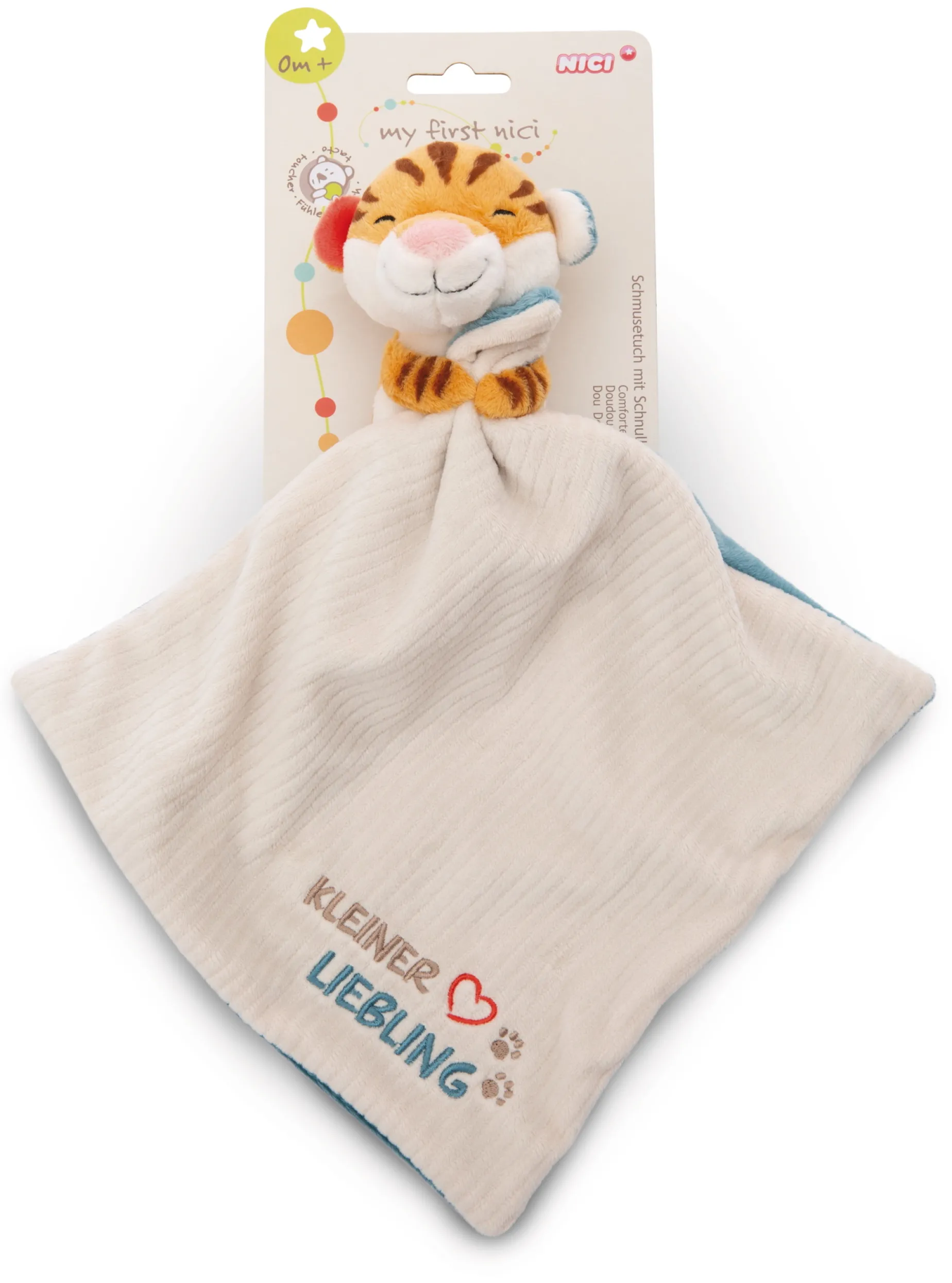The MyFirst NICI comforter with the soft toy tiger combines detailed design with high-quality, particularly soft and light materials. So soft for cuddling and perfect for sucking, the comforter gives baby a feeling of security and quickly becomes indispensable. The small fluffy plush tiger, which holds the soft rectangular blanket in one corner with its paws, enchants with its charming facial expressions and appealing colouring. Multiple fabrics invite for sensory discoveries and the size of the two-coloured cuddle cloth also makes it a cute companion for baby’s first months and beyond. The embroidered “Kleiner Liebling” lettering comes with a heart and makes the comforter a wonderful gift idea for little sweethearts!