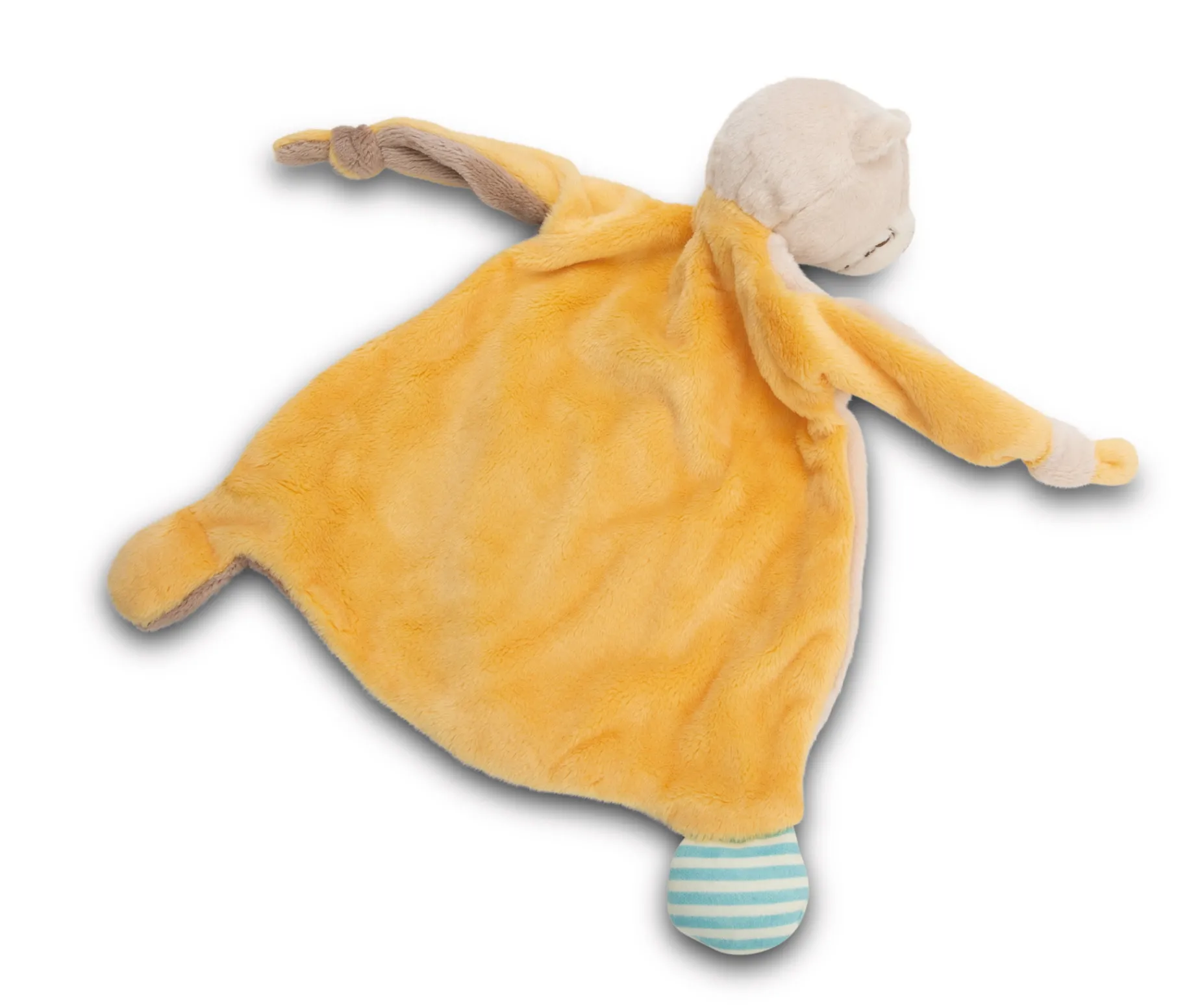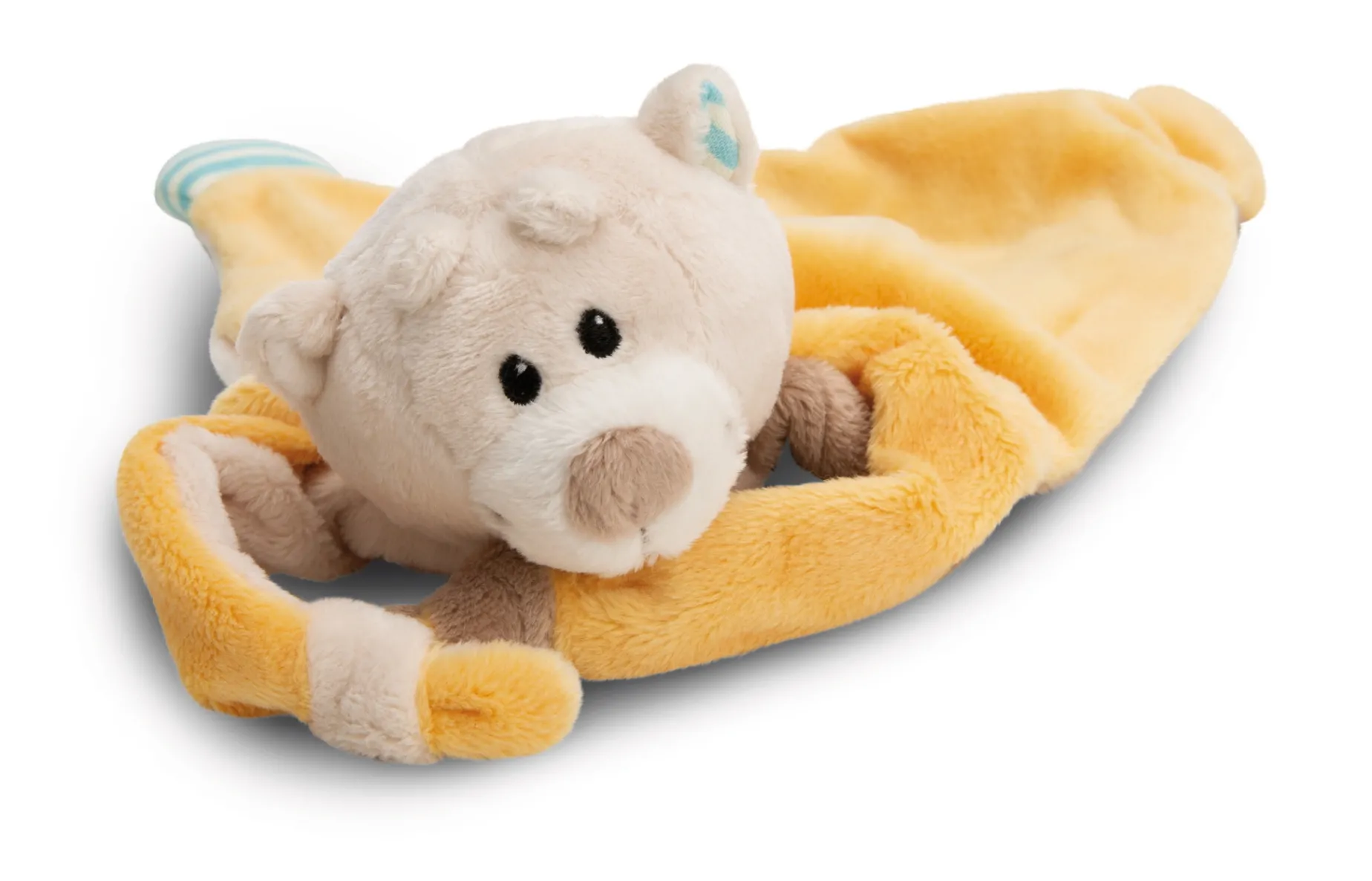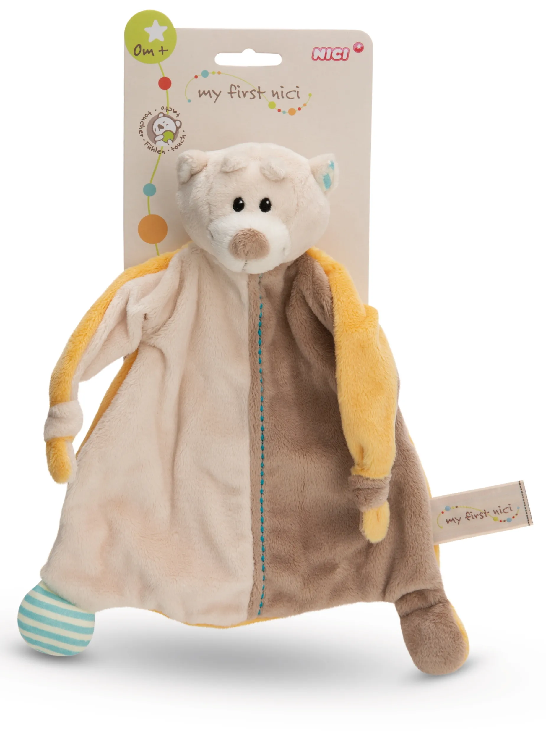 NICI bear Taps as a cuddly plush cuddle cloth. His fur is beige and brown on the front and sunny yellow on the back. His friendly face makes him a sweet companion for babies from birth.