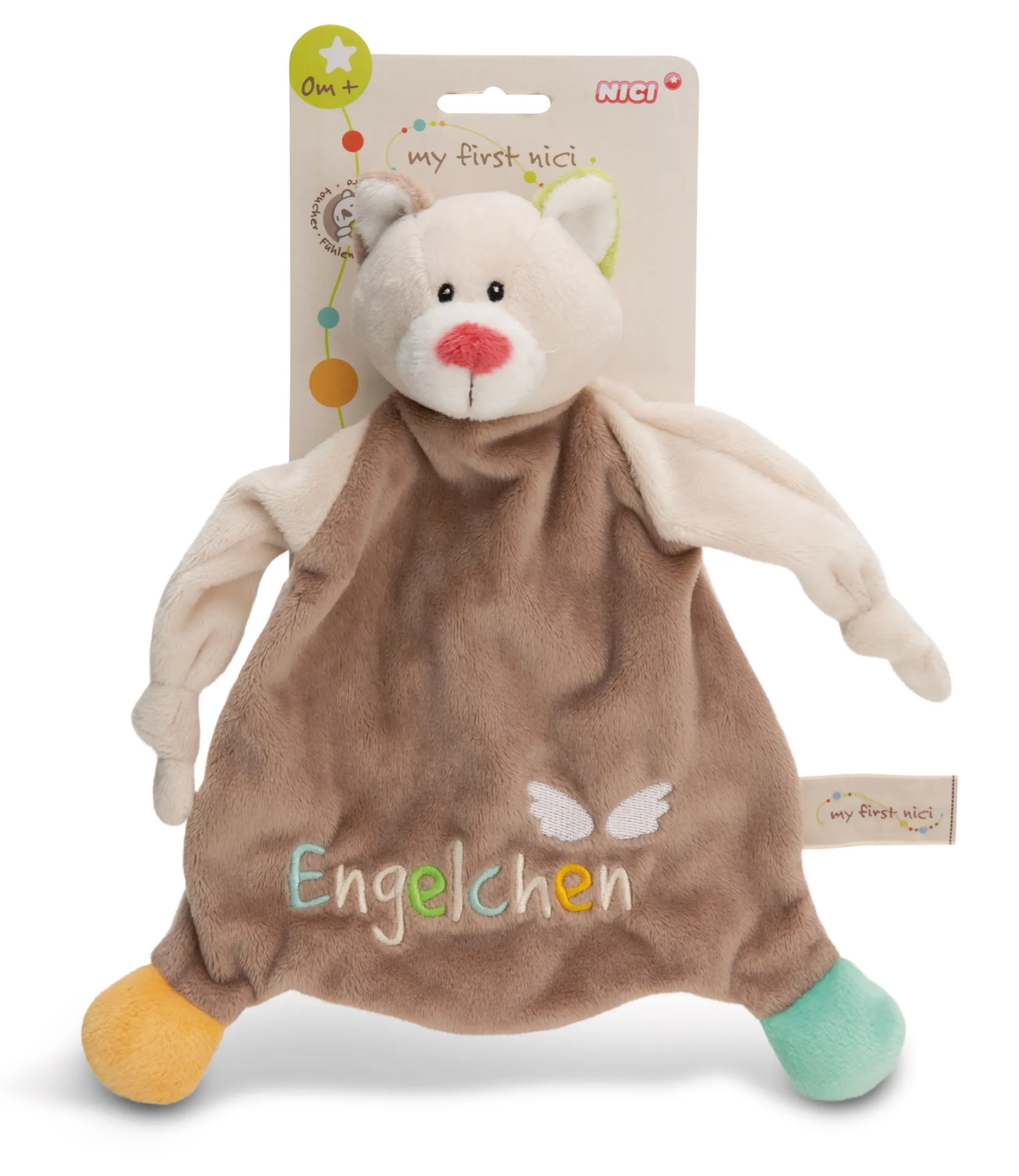This My First NICI cuddle cloth with the head of a cat is made of incomparably soft NICI plush in beige and light brown. The ears above the friendly smiling face are light green and brown. The feet are yellow and turquoise set off. On the belly of the cuddle cloth is the word.