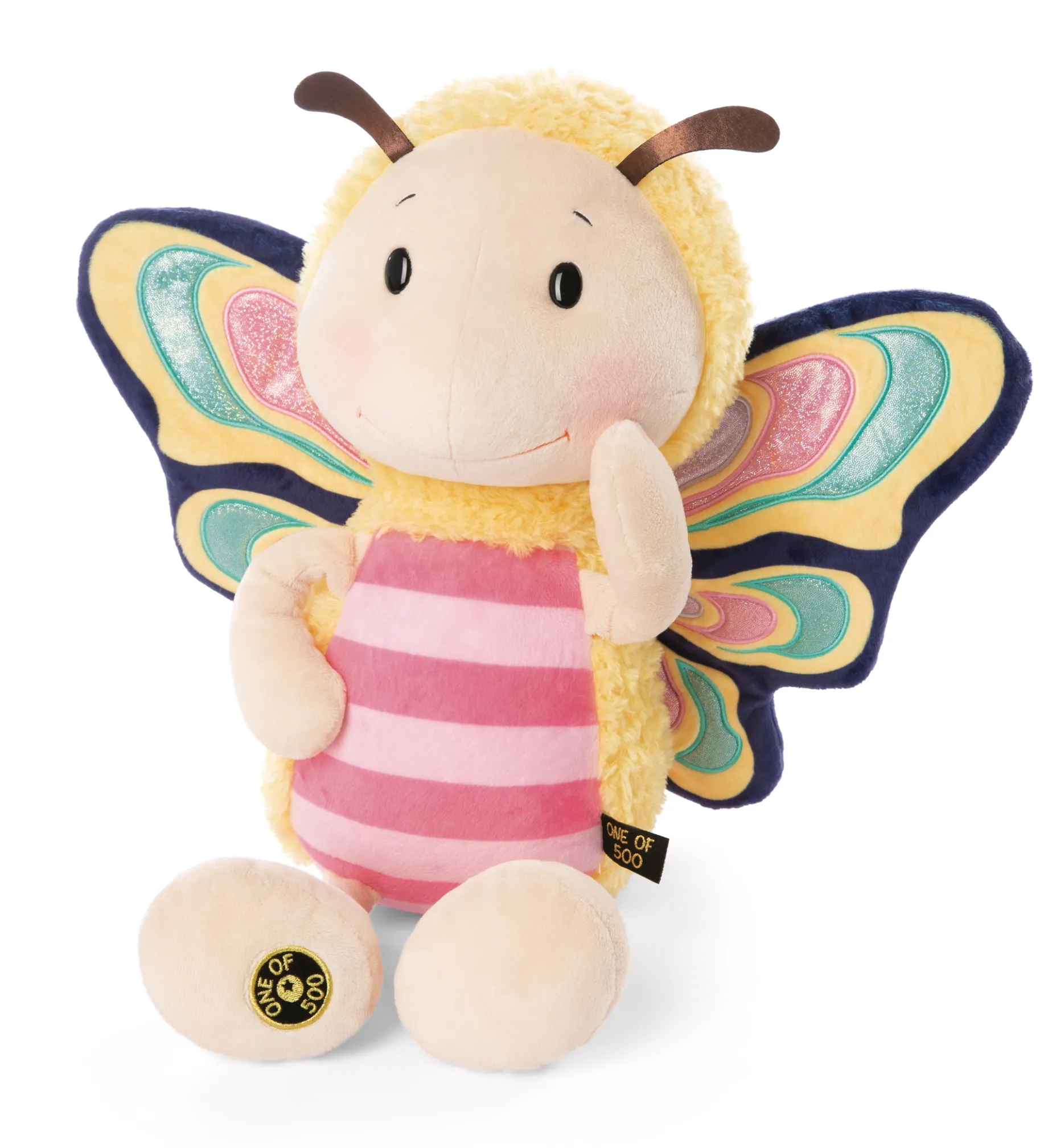 The colourful butterfly made of soft fluffy NICI plush and a size of 50 cm is absolutely adorable and so cuddly soft that you just have to love it. The well-known high quality and manufacturing leaves nothing to be desired. The butterfly was designed and produced with great attention to detail and is particularly enchanting with its blaze of colour, the elaborately appliquéd wings and the cute facial expression. A small label on the body and the foot of the cute fluttering creature indicate the exclusivity of the unique plush animal. Limited to 500 pieces, the butterfly is not only suitable for little fans, but also makes collectors’ hearts beat even faster.