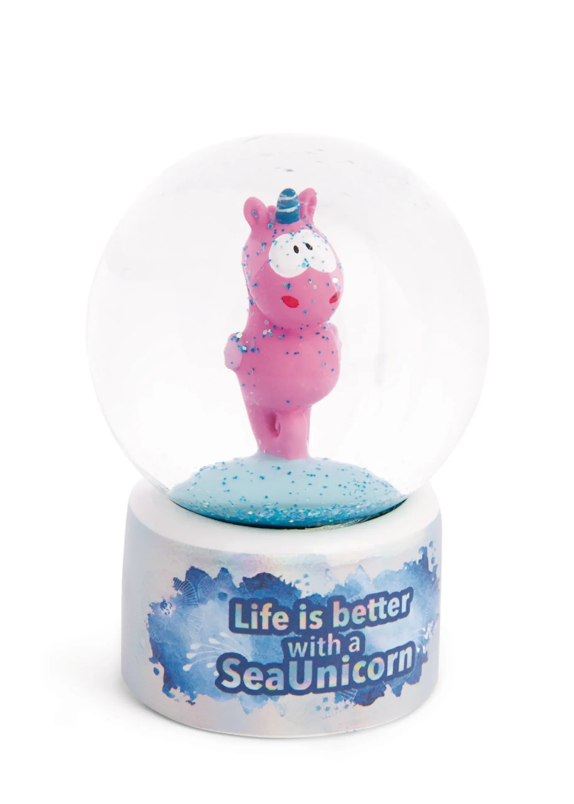 Seahorse Laguna Rainbow is a graceful symbiosis of unicorn and seahorse and adds a touch of sea magic to any home. The magenta seahorse standing in the glitter globe is thrilled by the glitter particles dancing around as soon as the globe is moved. The base of the ball is decorated with iridescent effects and the slogan “Life is better with a sea unicorn”. The enchanting glitter globe is a unique gift for all fans of magical sea creatures!