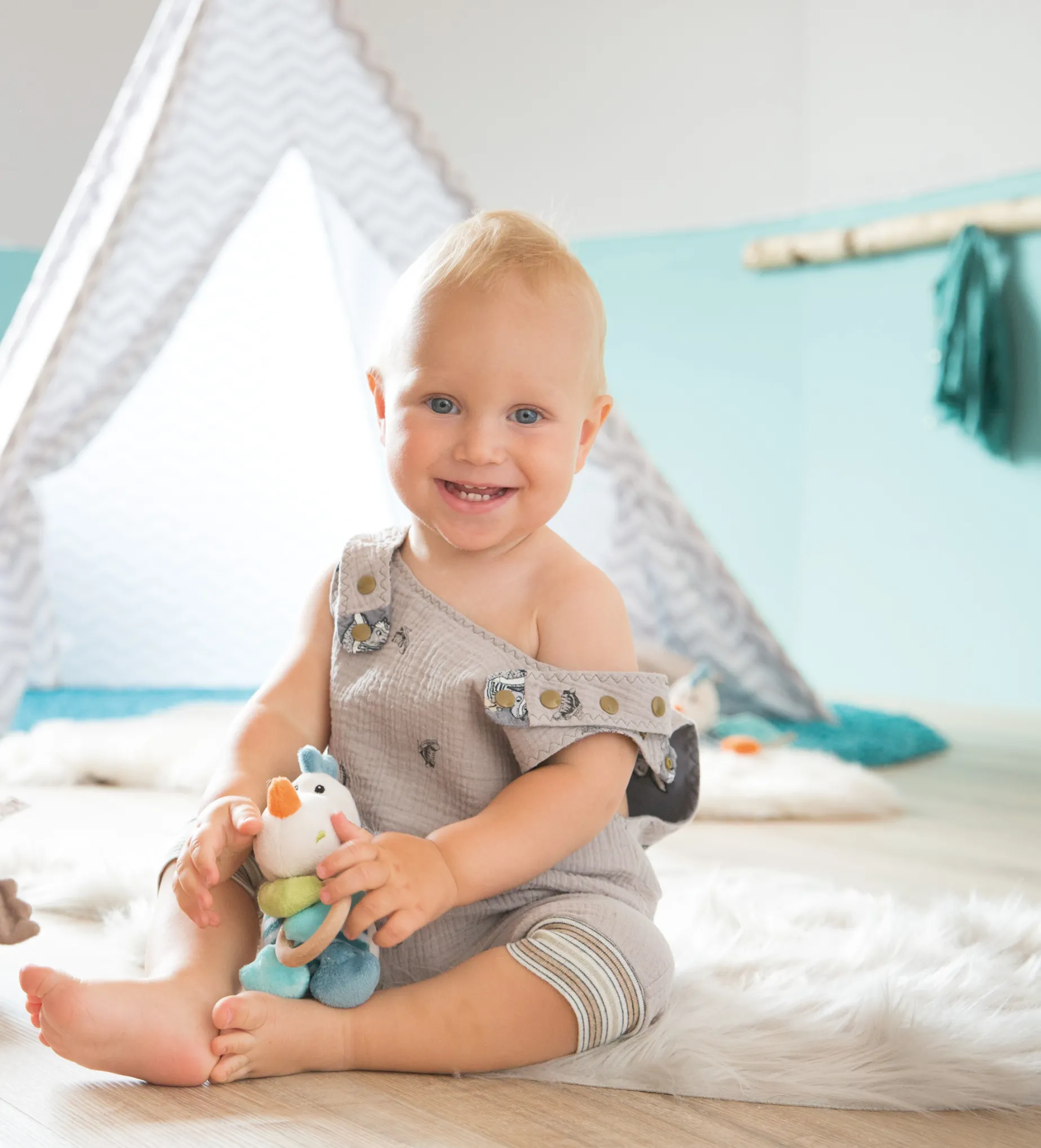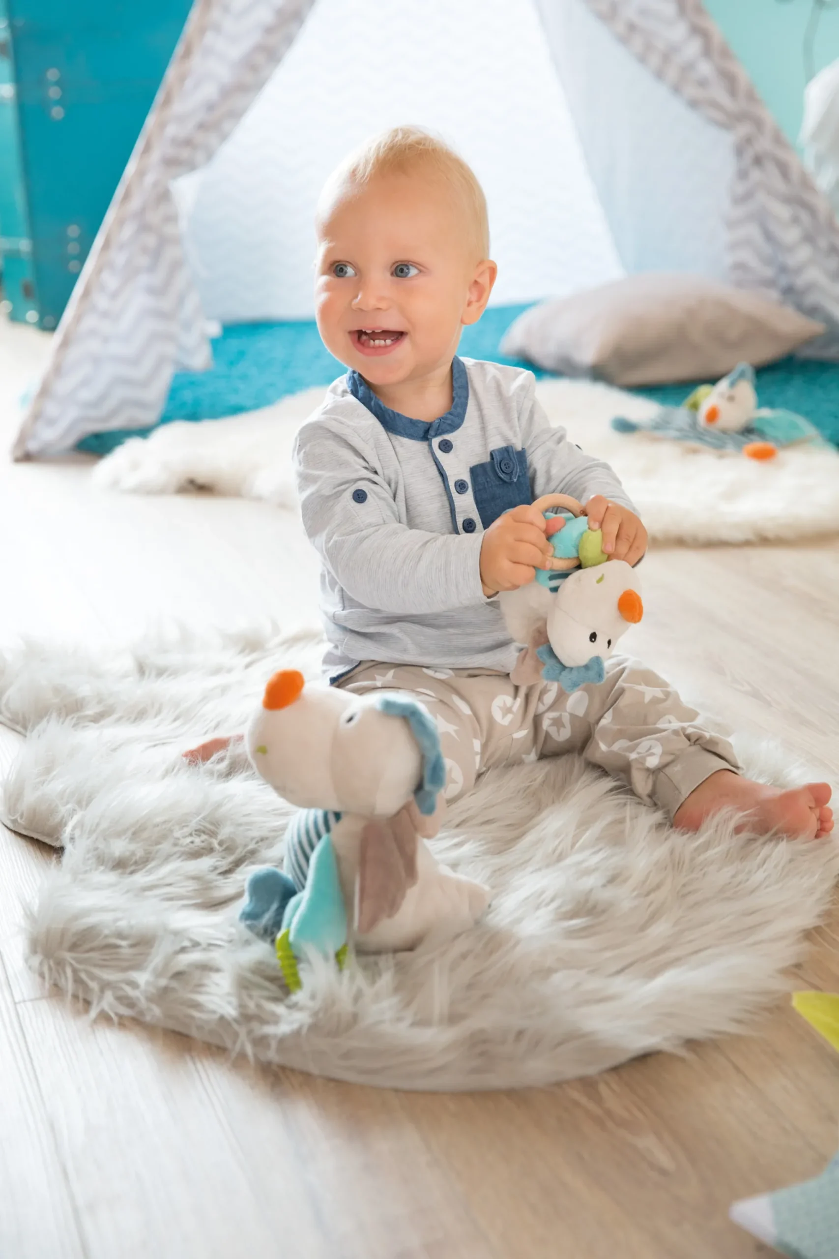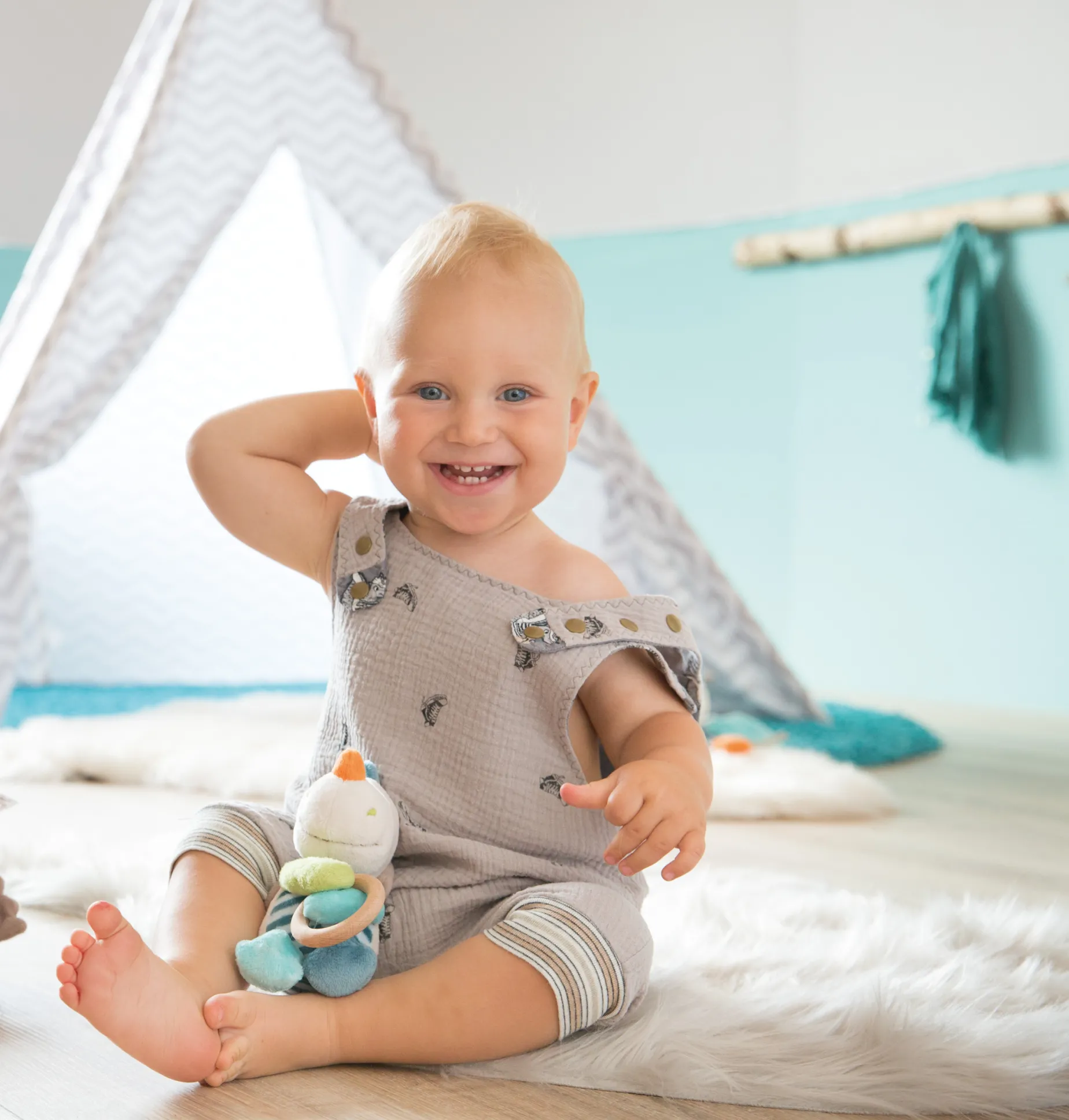 The cute dragon Draguli is a cuddly friend and grasping toy in one. He is made of high-quality NICI plush and comes with a little bell in his tummy that rewards first attempts of movement with a gentle sound. The grasping toy is suitable for babies aged three months and older and stimulates fine motor skills, tactile senses and the sense of hearing. The different materials offer the baby tactile stimuli and invite them to discover and grasp. A wooden ring, which is held between the dragon Draguli’s arms with a Velcro fastener, can be easily removed for washing. The wooden ring can also help with teething as it relieves the baby when chewing on it.