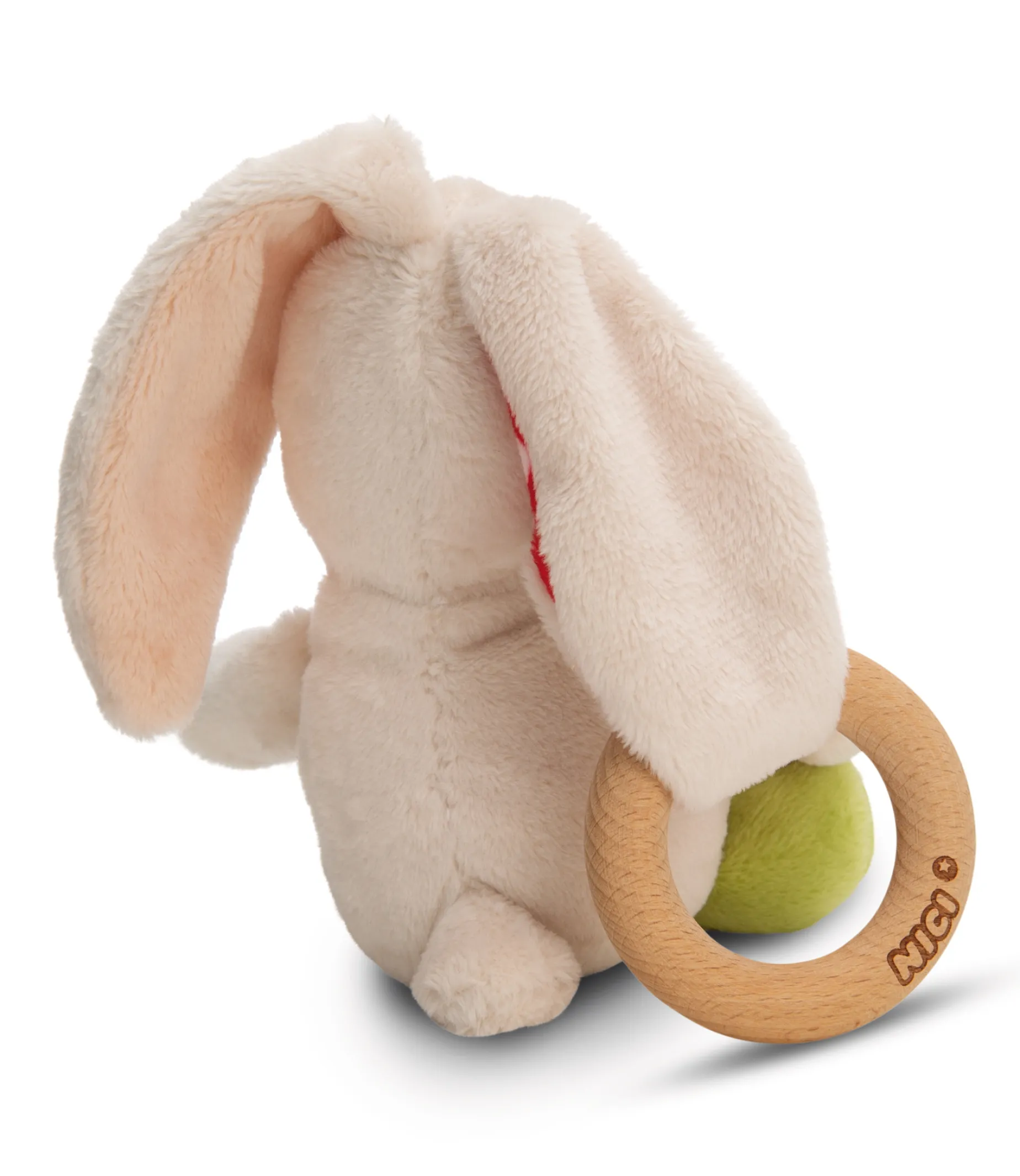 Hase Tilli als niedlicher Greifling aus bestem NICI Kuschel-Plüsch. Der Hase mit den bunten Details und langen Schlappohren hat einen Beißring aus Holz dabei. Auf dem kann man wunderbar herumkauen, wenn die ersten Zähnchen wachsen und das Zahnfleisch juckt. Der Ring ist mit einem Klettverschluss befestigt. Er kann abgenommen werden, dann kann Tilli als Kuscheltier benutzt oder in der Waschmaschine gesäubert werden.
