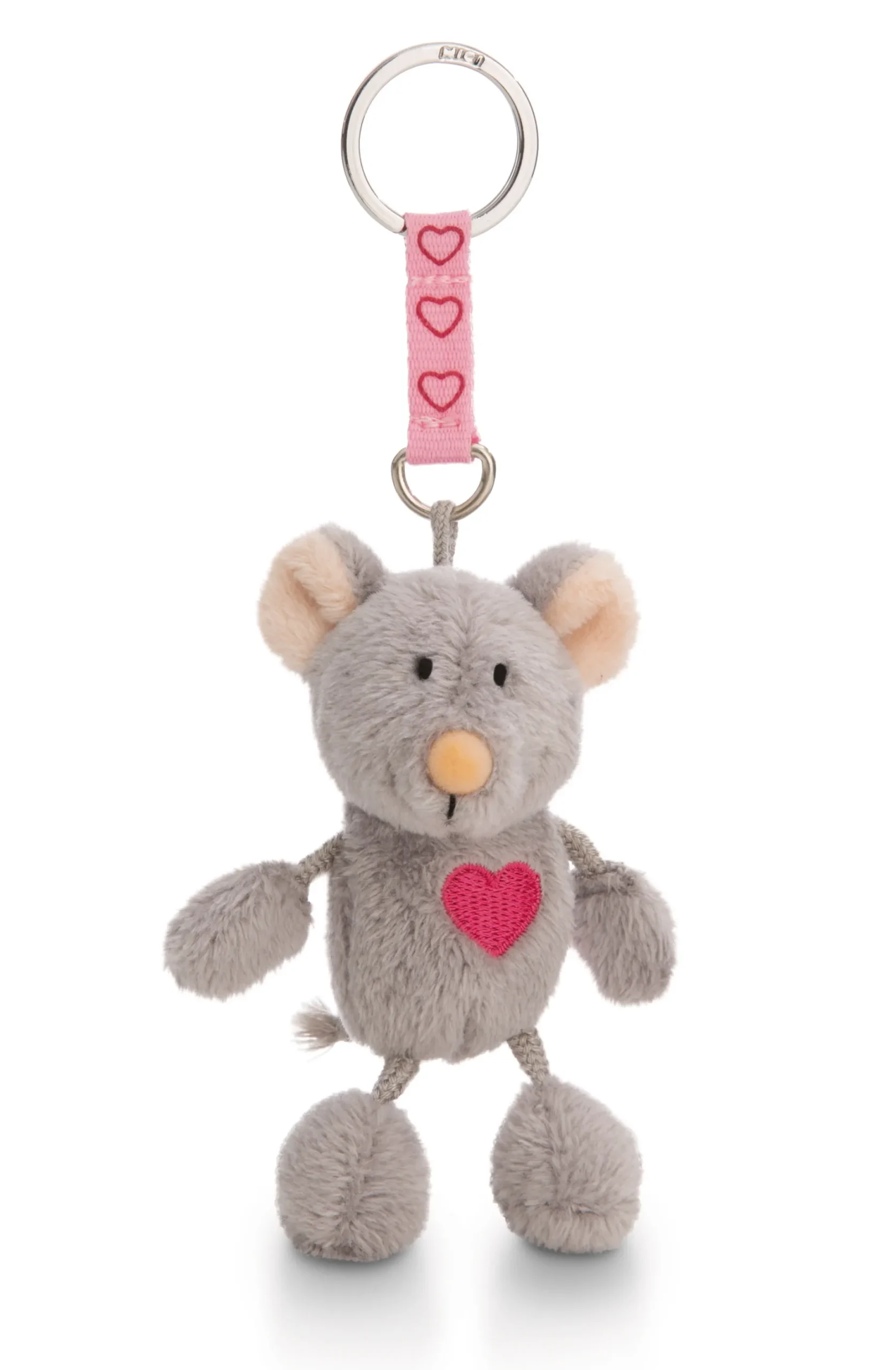 The key ring with the little gray mouse is made of soft gray plush. On the chest, the little lucky charm pendant wears a red heart.