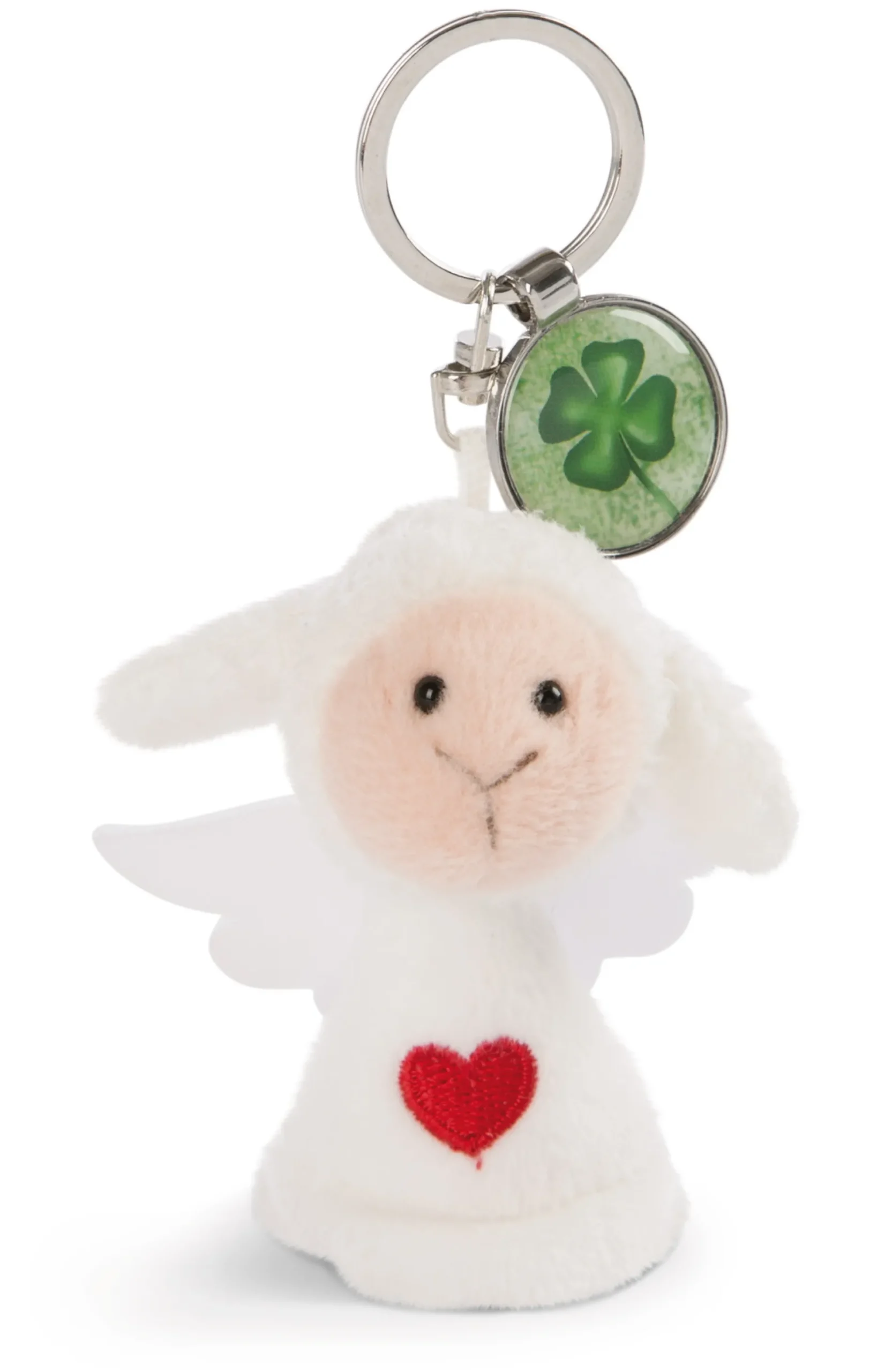 Everyone needs a guardian angel! The white NICI angel made of particularly fluffy NICI plush enchants with its red embroidered heart in the right place and radiates protection and security. The little NICI guardian angel is equipped with a sturdy metal key ring with a round green charm pendant featuring a cloverleaf symbol. Whether on keys, bags, backpacks or satchels – the 7cm NICI plush angel is a lucky charm for everyday life and a lovely gift for any age and any occasion.