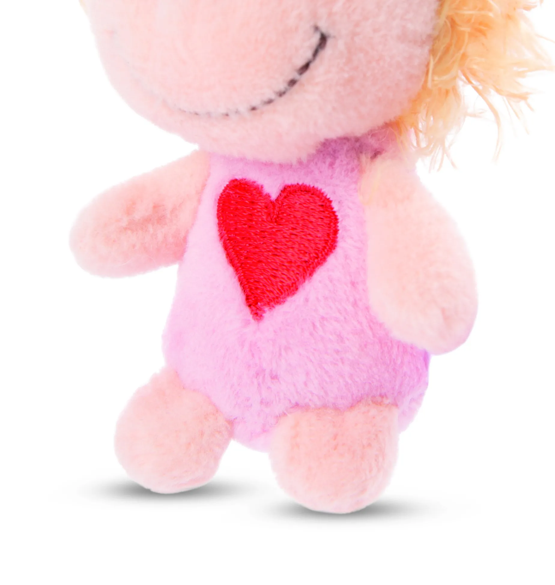 The cuddly soft NICI plush key holder in the shape of a little blonde angel is equipped with a sturdy metal key ring. Whether on a bunch of keys, a purse, a school bag or a backpack – the little guardian angel is always with you and combines joy and protection. The friendly little angel wears a pink dress with red heart embroidery and white wings that give the angel a heavenly appearance. The 7cm key holder is the perfect gift for young and old alike and is suitable for any occasion. It conveys the loving message Bin immer bei dir.
