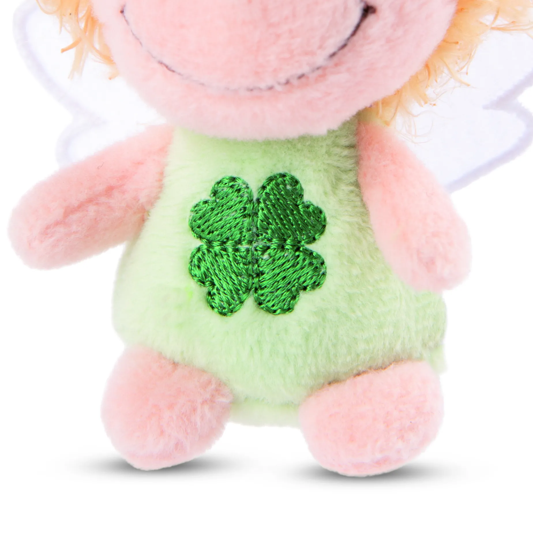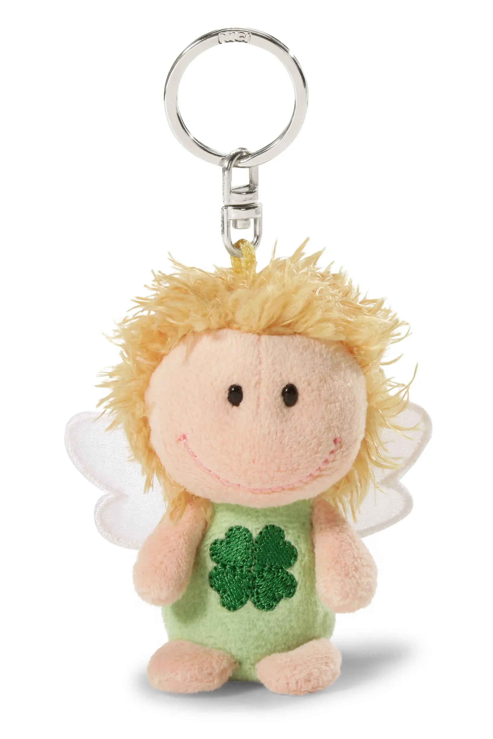 The cuddly soft NICI plush key holder in the shape of a little blonde angel is equipped with a sturdy metal key ring. Whether on a bunch of keys, a handbag, a school bag or a backpack – the little guardian angel is always with you and brings joy and happiness. The friendly little angel wears a green dress with green shamrock embroidery and white wings, which give the angel a heavenly appearance. The 7cm key holder is the perfect gift for young and old alike and is suitable for any occasion. It conveys the loving message Ich bring dir Glück.