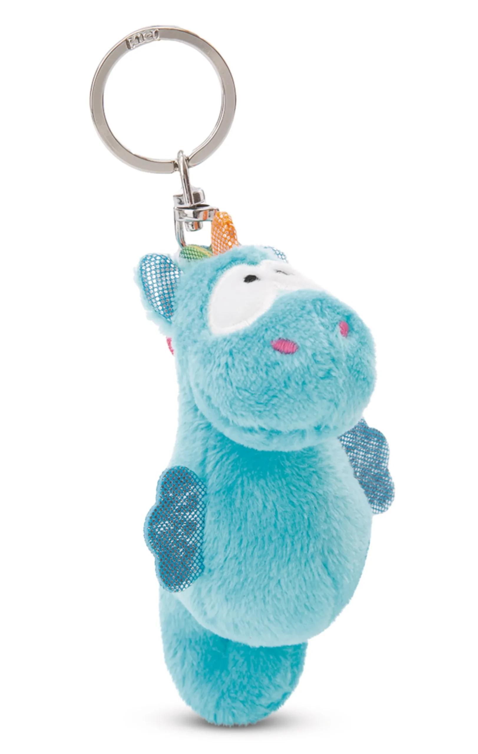 So unique and so cute! The enchanting Laguna Rainbow, a fluffy soft seahorse with the horn of a magical unicorn, accompanies her fans in everyday life true the motto “Life is better with a sea unicorn”. With the help of a sturdy metal ring on the head, the 9cm plushy sea unicorn can be attached to your keys, backpack or school bag. The blue sea creature is an adorable gift for young and old and fascinates with its gently curved body, glittering head horn, an embroidered shell on the flank and small fins in rainbow colours. The key holder is part of the NICI GREEN product world. For NICI GREEN products, we almost exclusively use plush and filling material made from recycled materials. Primarily recycled PET bottles are processed into RPET for this purpose.