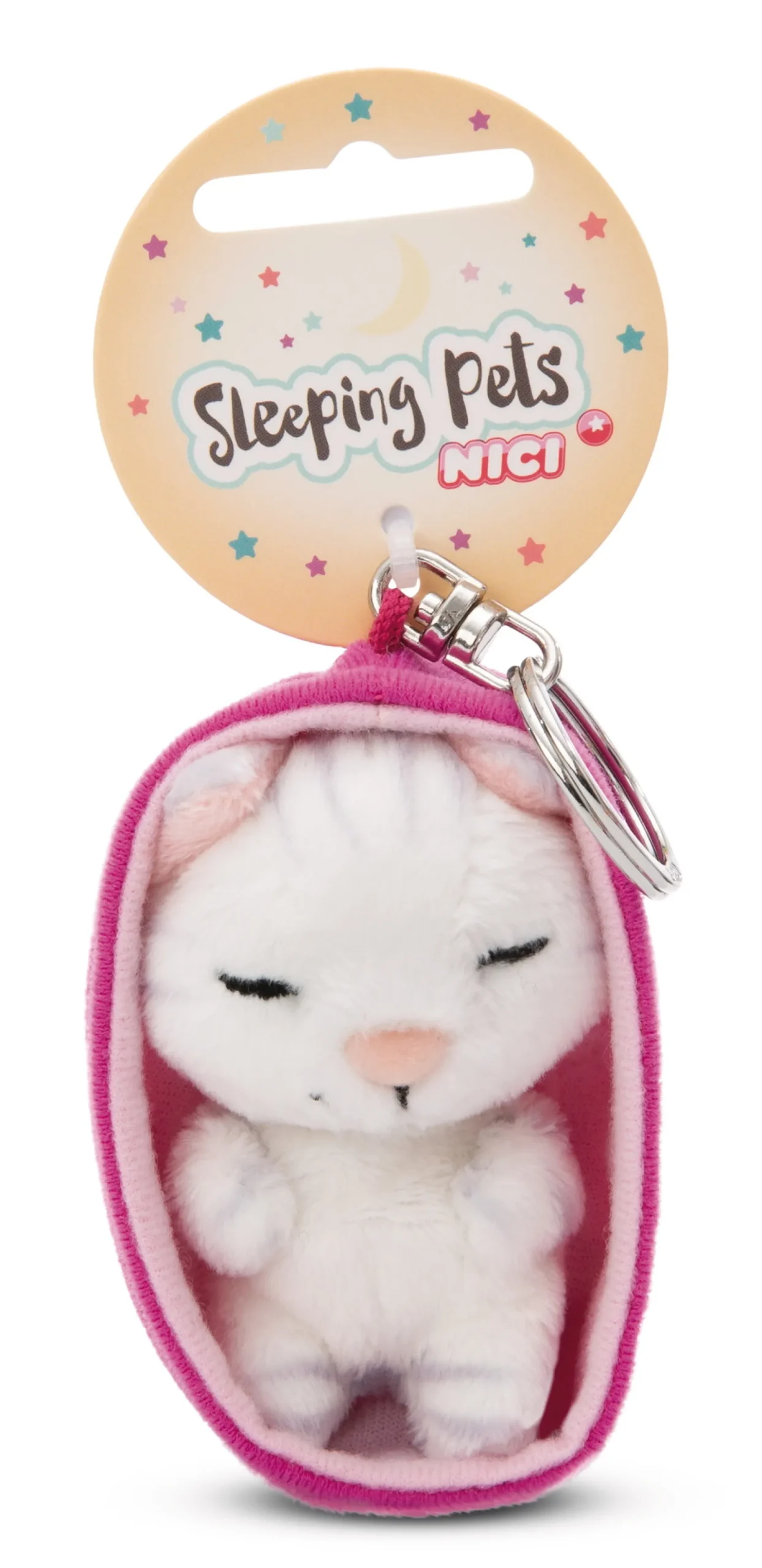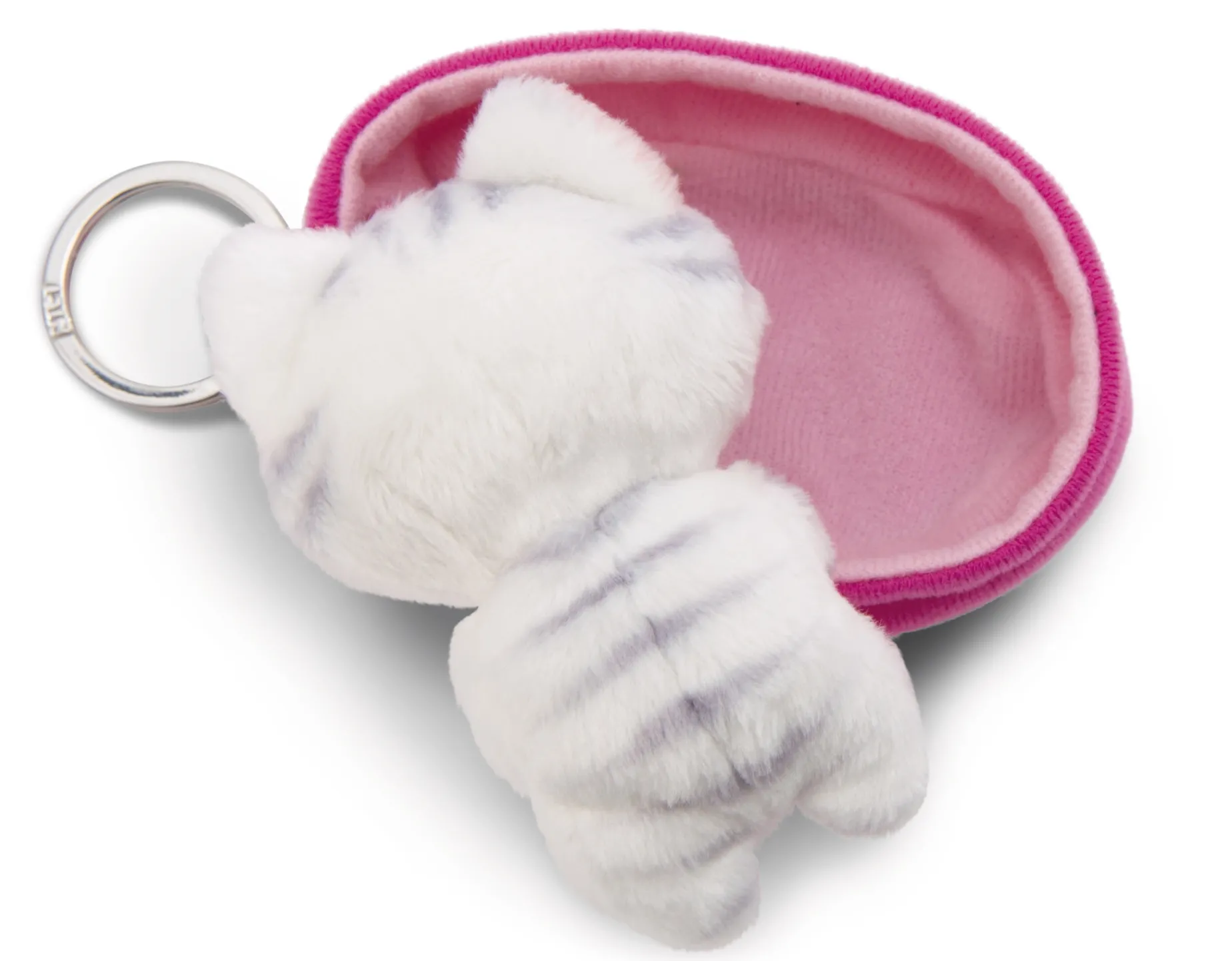 Meow! From now on, the Sleeping Pets cat will always want to be with you as an 8cm keyholder made of fluffy soft NICI plush! The white kitten with pale grey stripes, an extremely charming facial expression and elaborately embroidered sleeping eyes has made itself very comfortable in its mauve coloured plush basket. Thanks to the sturdy metal key ring, the white Sleeping Pets cat can not only be attached to your keys, but is also a loyal companion on your backpack, school bag or purse. The Sleeping Pets Keyholder is part of the NICI GREEN product world. For NICI GREEN products, we almost exclusively use plush and filling materials that are made from recycled materials. Primarily recycled PET bottles are processed into RPET for this purpose.
