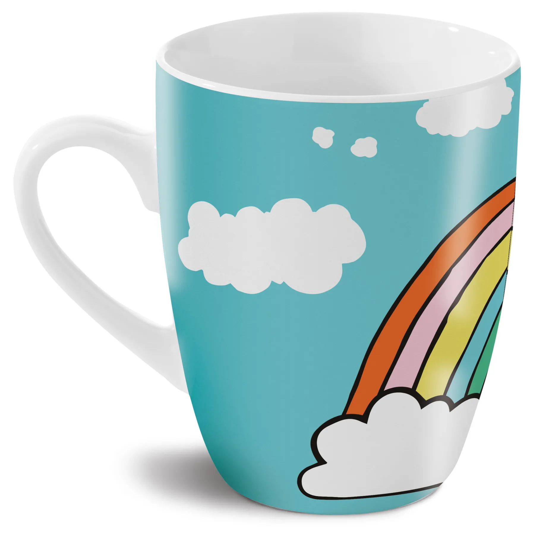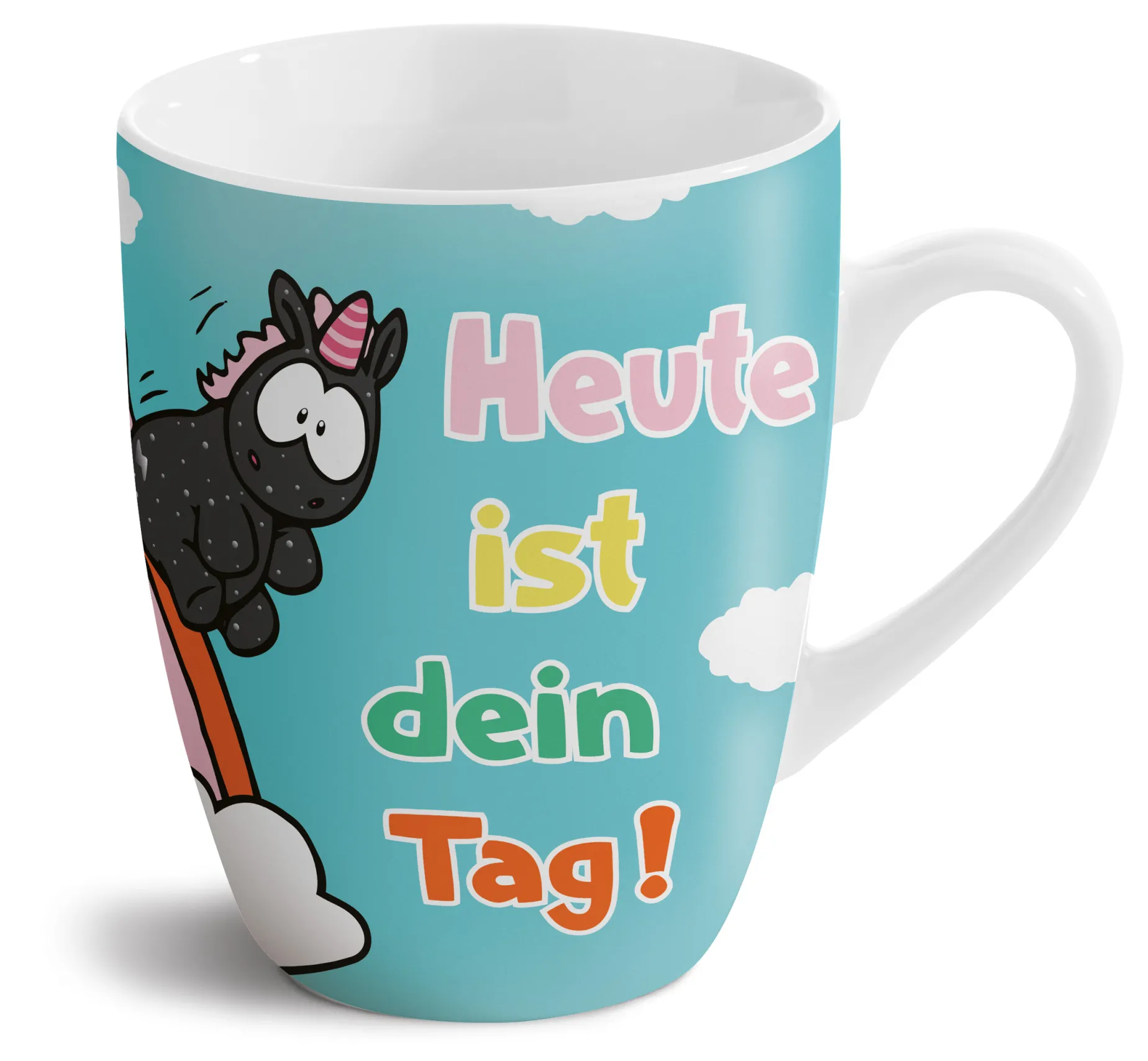 Das schwarze NICI Einhorn Carbon Flash rutscht auf dieser Tasse gut gelaunt einen Regenbogen herunter. Rechts von ihm stehtDas schwarze NICI Einhorn Carbon Flash rutscht auf dieser Tasse gut gelaunt einen Regenbogen herunter. Rechts von ihm steht
