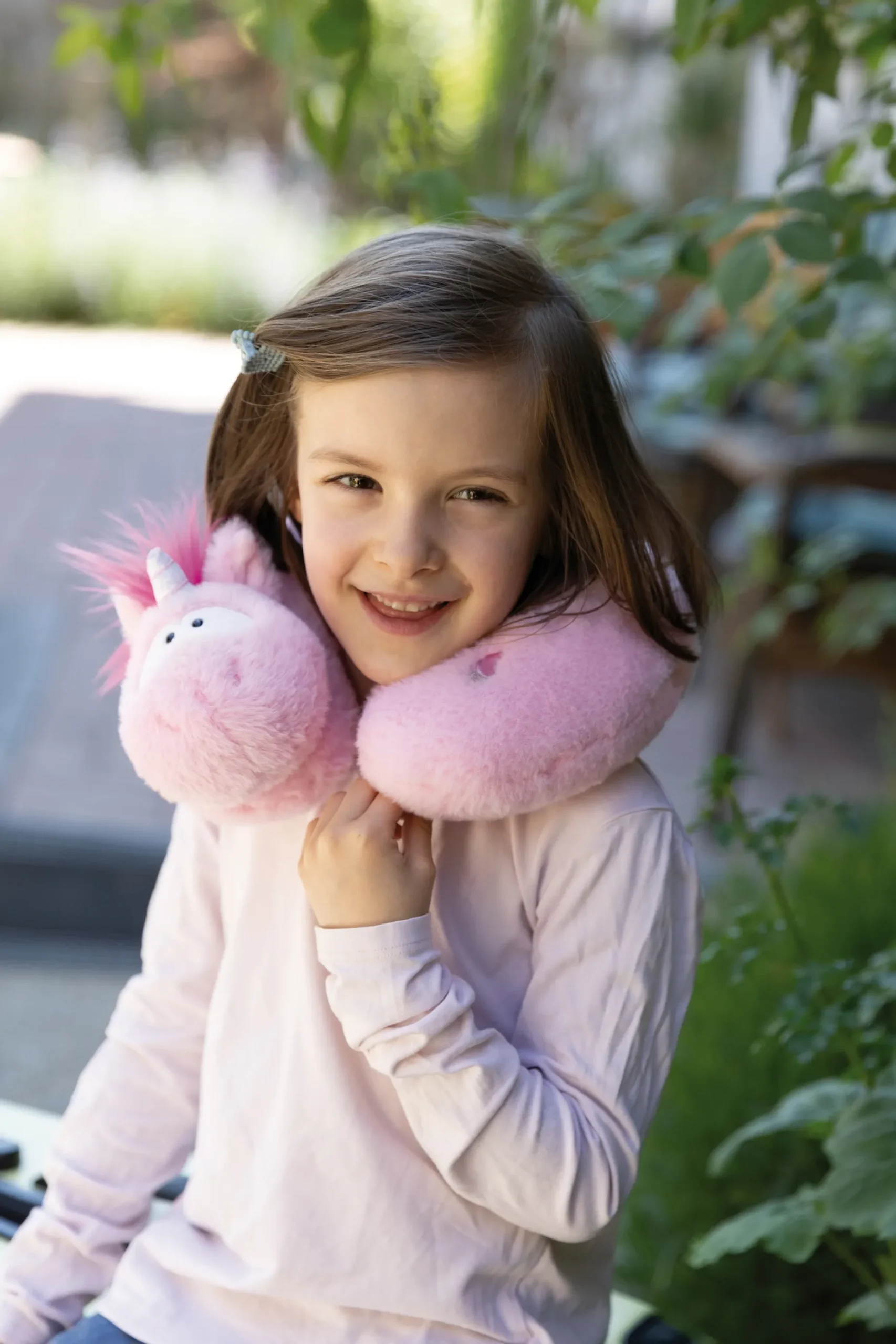 Watch out unicorn fans! An enchanting, pink unicorn wants to snuggle up to you as a cuddly soft U-shaped neck pillow and comfortably pad and support your head and neck. With its imposing unicorn on its head and cute tuft of hair, this adorable mythical creature is ideal for travelling by car, plane or train. Little princesses can also enjoy the ergonomically shaped neck support in the bike seat or buggy, as it provides soothing relief for the cervical spine and shoulder area. The high-quality NICI plush material and precise workmanship make the 25 x 25cm neck pillow a practical and charming everyday companion.