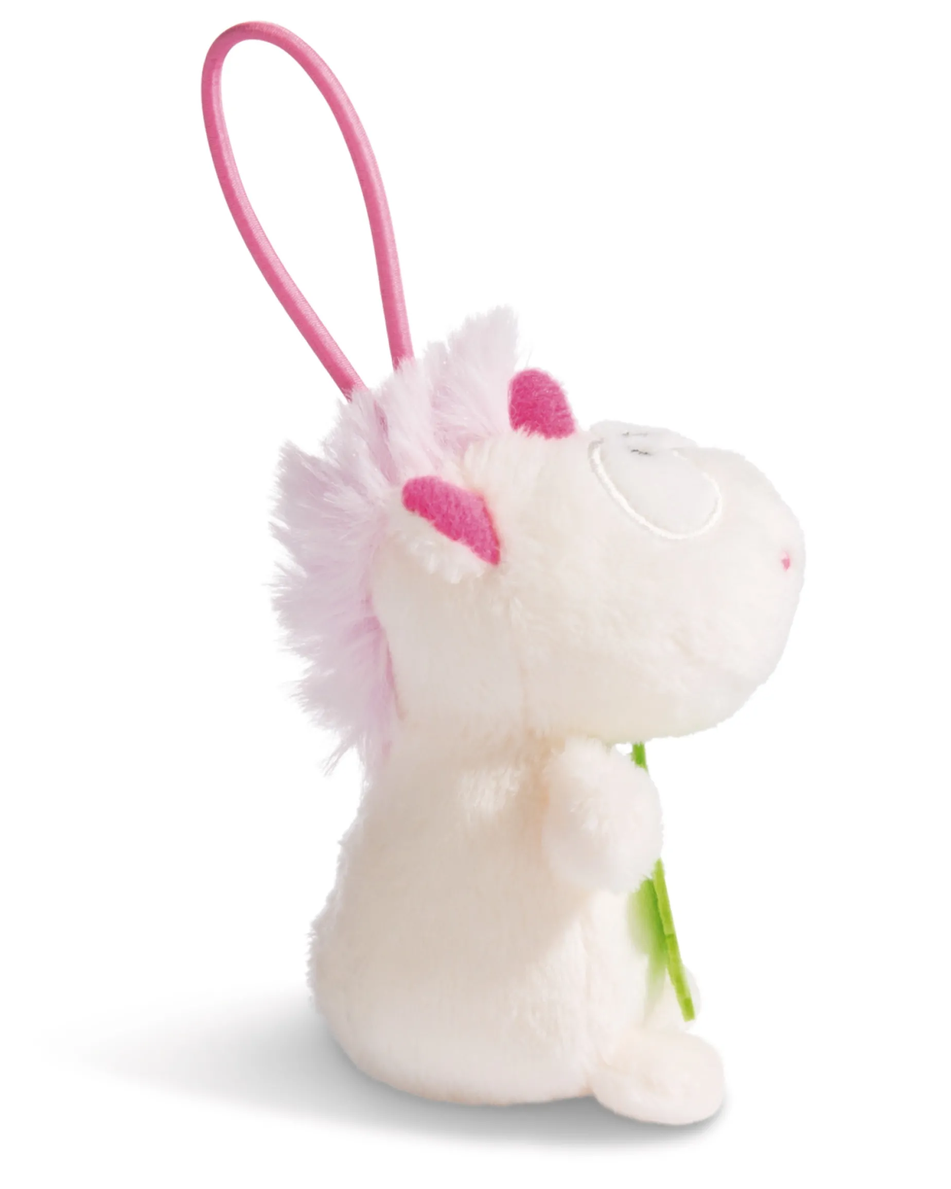 Give away a piece of luck with this pendant made of cuddly soft NICI plush. The popular unicorn Theodor likes to be a messenger of good luck and holds a bright green felt sign with the words GLÜCKSEINHORN in front of his big white belly. The 8 cm plush pendant can be attached anywhere thanks to the small pink elastic loop on the unicorn’s head.