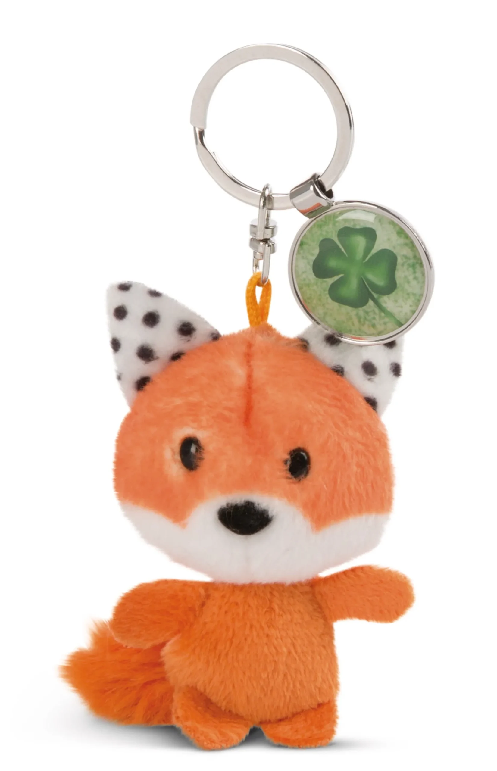A red fur fox with dotted ears accompanies young and old as a cute keyholder made of fluffy soft NICI plush. With the cloverleaf pendant, the plushy fox turns into a adorable lucky charm.