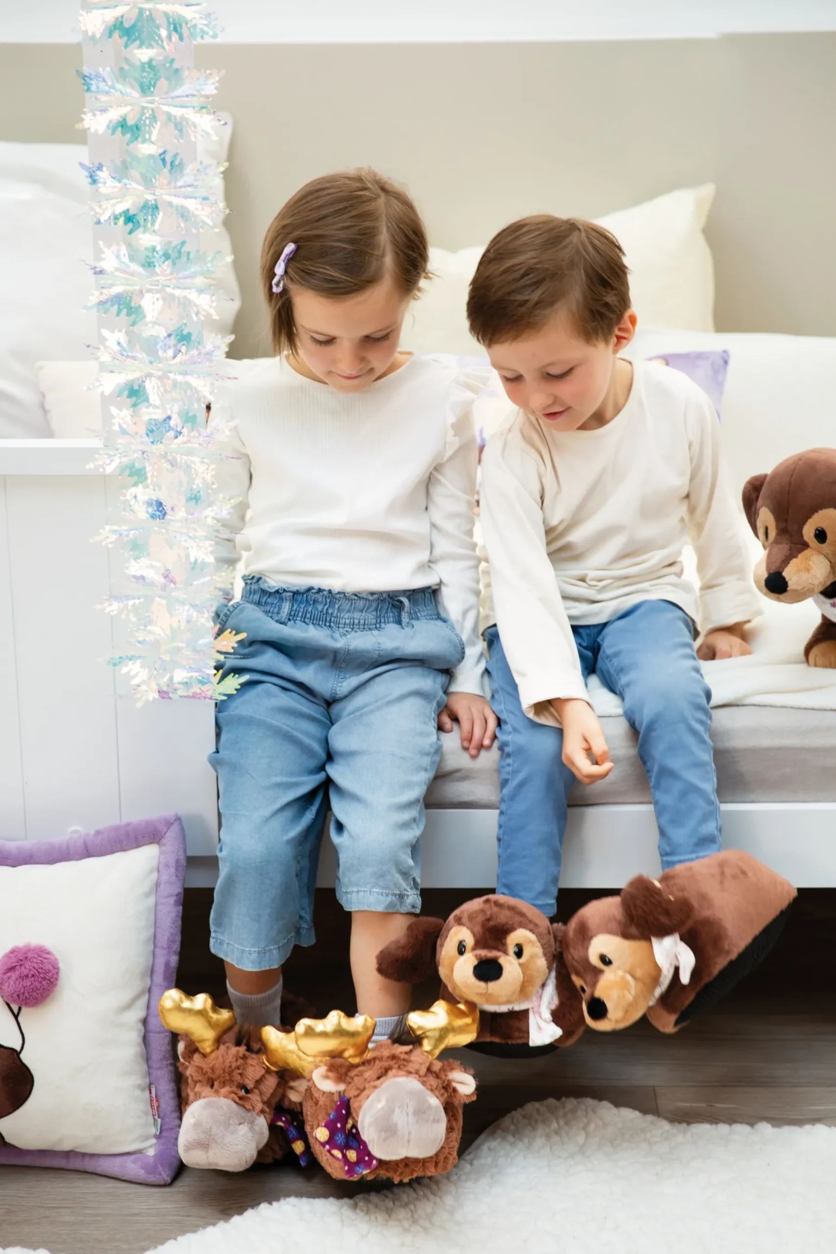 Dachshund fans watch out! These slippers are a hit! The brown dachshund girl Skida with her typical floppy ears and a wintery cuddly scarf not only warms your feet as a NICI plush slipper, but also your heart. Thanks to the extra-soft filling and an integrated elastic band, the cuddly animal slippers fit the foot perfectly, so that one shoe covers several conventional shoe sizes. The sole is thick and insulating and has knobs that make the plush slippers grippy. A great gift for children and young-at-heart adults. The slippers are part of the NICI GREEN product world. For NICI GREEN products, we almost exclusively use plush and filling material made from recycled materials. Primarily recycled PET bottles are processed into RPET for this purpose.