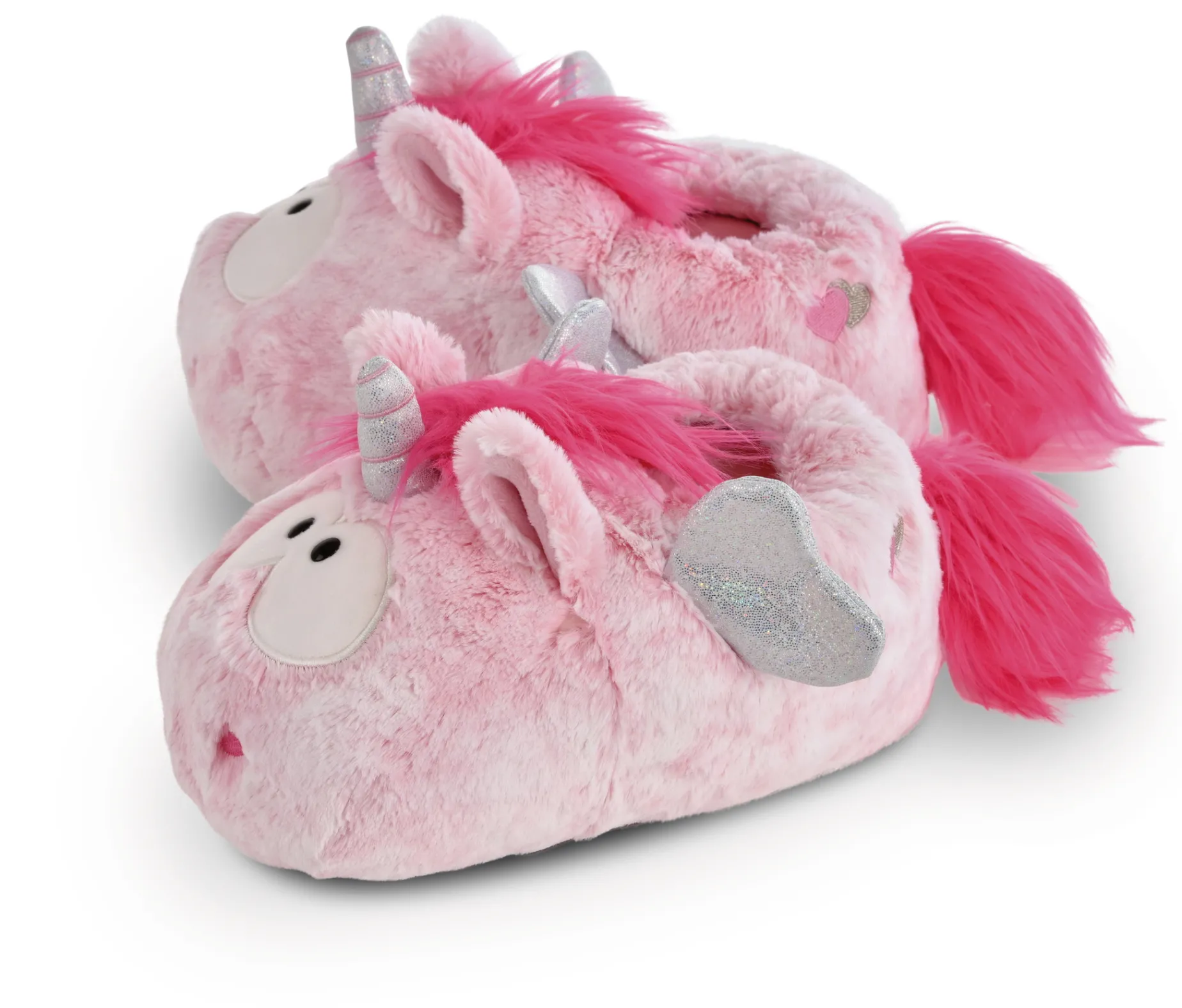 The cuddly NICI plush slippers in the design of Unicorn Pink Harmony are not only foot-warming but also heart-warming at the same time. They are a real eye-catcher and exude feel-good flair throughout the house. Special highlight are the glittering, silver wings in heart shape on each side. Due to the extra-soft filling and an integrated elastic band, the cuddly animal slippers fit the foot wonderfully, which means that one shoe covers several conventional shoe sizes at once. With the plush slippers from NICI, the relaxing part of the day begins. Perfect for children and young at heart adults.