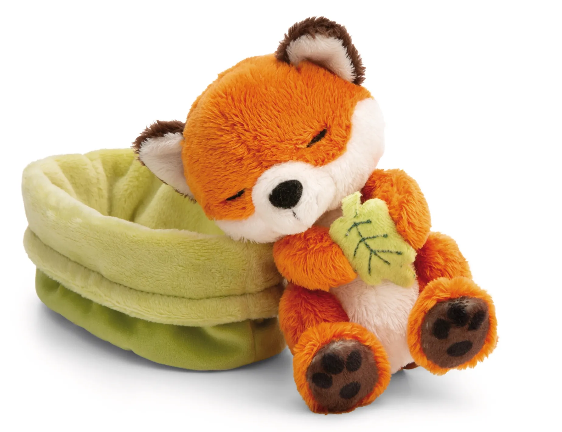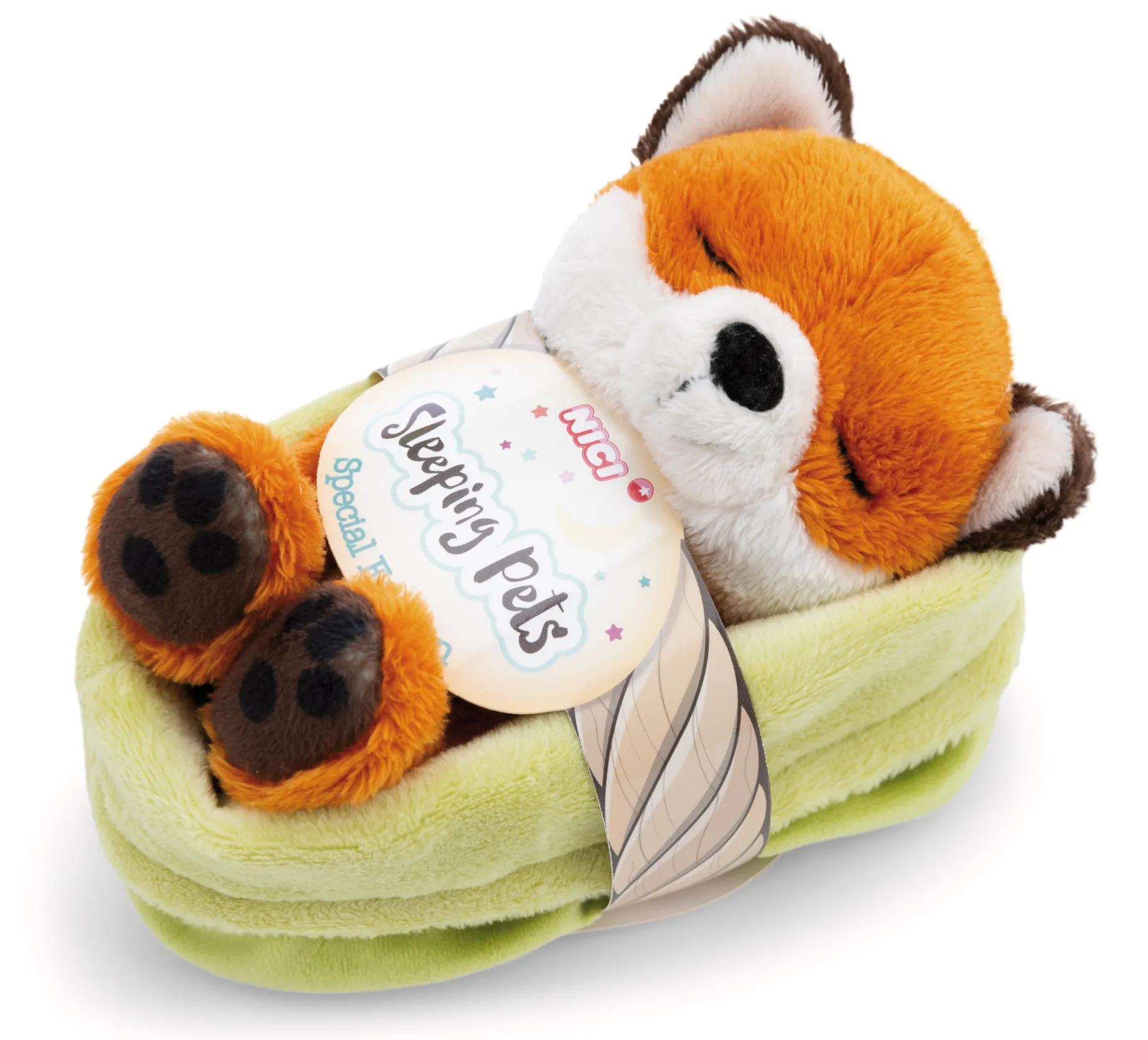 So cute to fall in love with! Whether for cuddling, playing, comforting or falling asleep – the cute fox kitten enchants with its fluffy plush fur in red-brown and white, embroidered sleeping eyes, pointed ears and a bushy tail. The sleeping baby fox holds a small, green leaf in its front paws and provides a particularly cuddly feel with its soft filling. The 12cm fox lies snuggled up in a green plush basket and not only feels homey and well taken care of, but can also be presented as a gift that way. The plush fox and plush basket are individually playable. The Sleeping Pets Fox is part of the NICI GREEN product world. For NICI GREEN products, we almost exclusively use plush and filling materials that are made from recycled materials. Primarily recycled PET bottles are processed into RPET for this purpose.