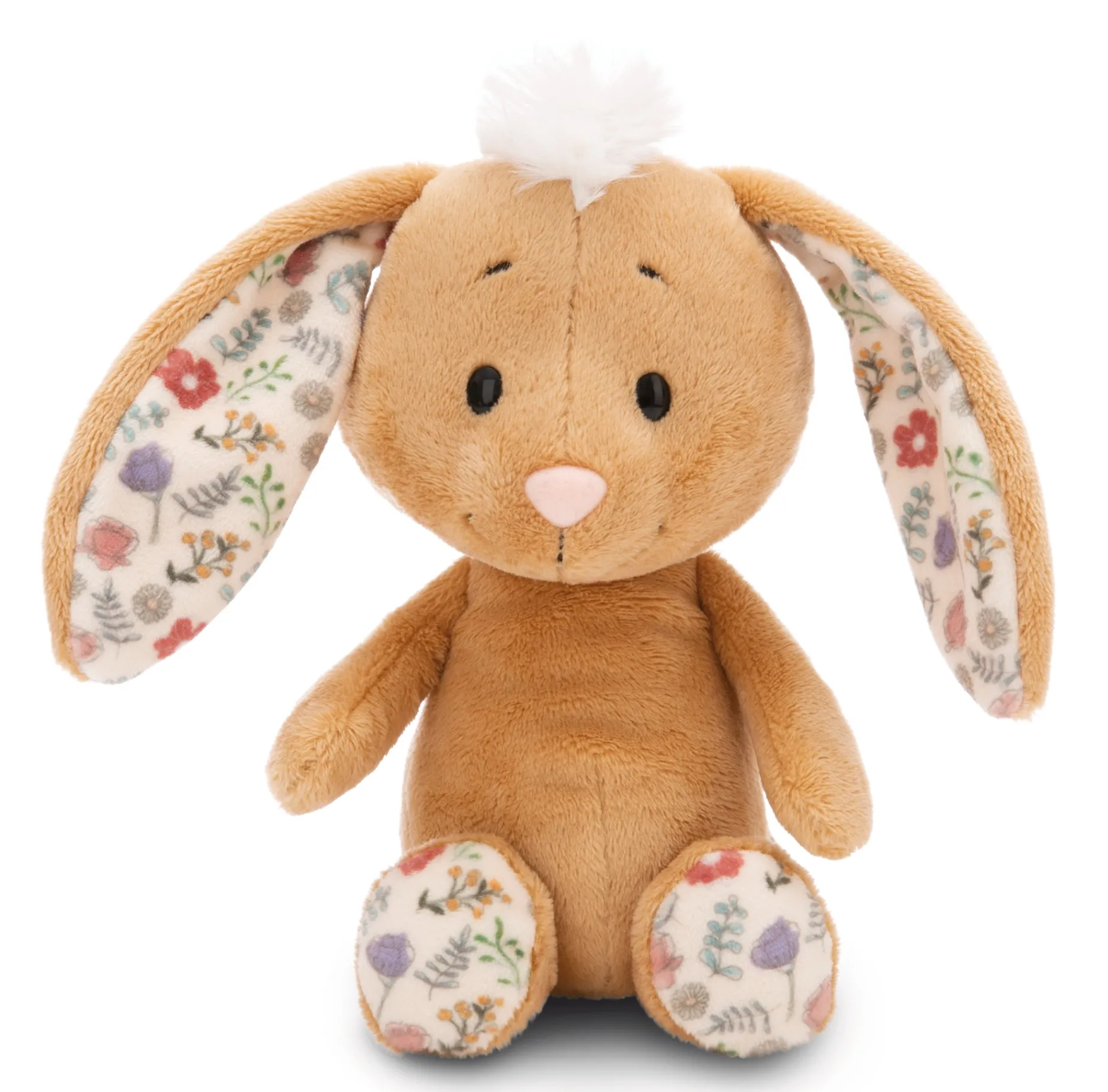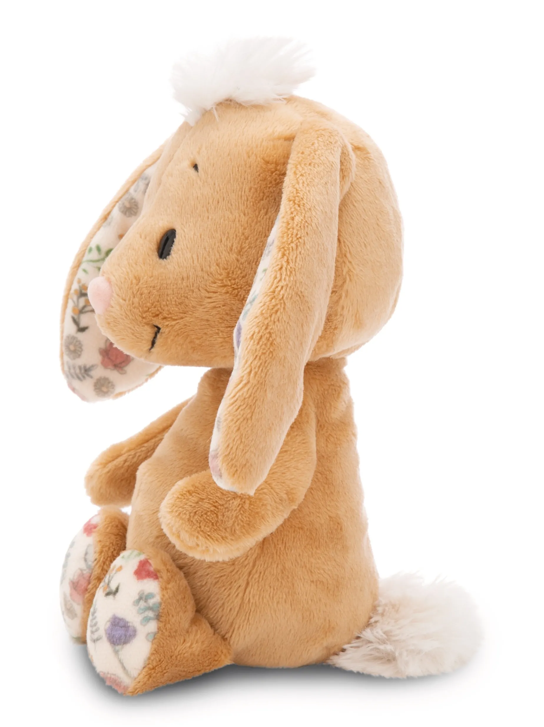 Hop, hop, hop into your Easter nest! This cute, light brown plush bunny with a funny tuft on his head will delight not at least with his soft fluffiness. Measuring 20cm, he is perfect for cuddling and loving. His soft plush body and charming facial expression will immediately put a smile on the faces of young and older bunny fans alike. The long floppy ears with a gentle floral pattern on the inner side, which can also be found on the bottom of the feet, give the Happy Rabbit bunny a particularly cute look. The Happy Rabbits bunny is part of the NICI GREEN product world. For NICI GREEN products, we almost exclusively use plush and filling materials that are made from recycled materials. Primarily recycled PET bottles are processed into RPET for this purpose.