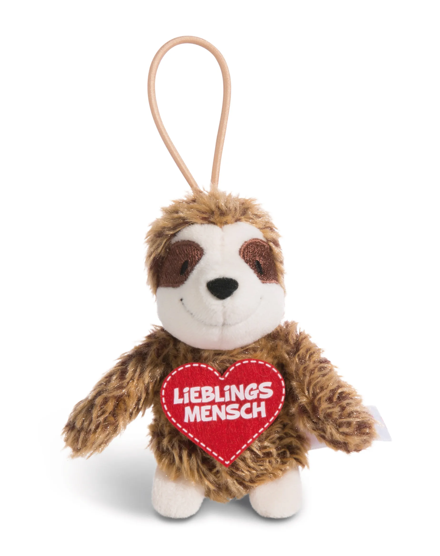 Doesn’t everyone have a favorite person? The 8cm sloth pendant made of fluffy soft NICI plush comes with a red felt heart in front of its belly and the message Lieblingsmensch. The elastic loop on the head of the little brown cuddly toy with the cheeky grin makes the pendant a practical companion and enchanting gift that can be attached almost anywhere. Whether on a bag, backpack, rear-view mirror, bunch of keys, etc. – The little cuddly plush friend will find a place anywhere.