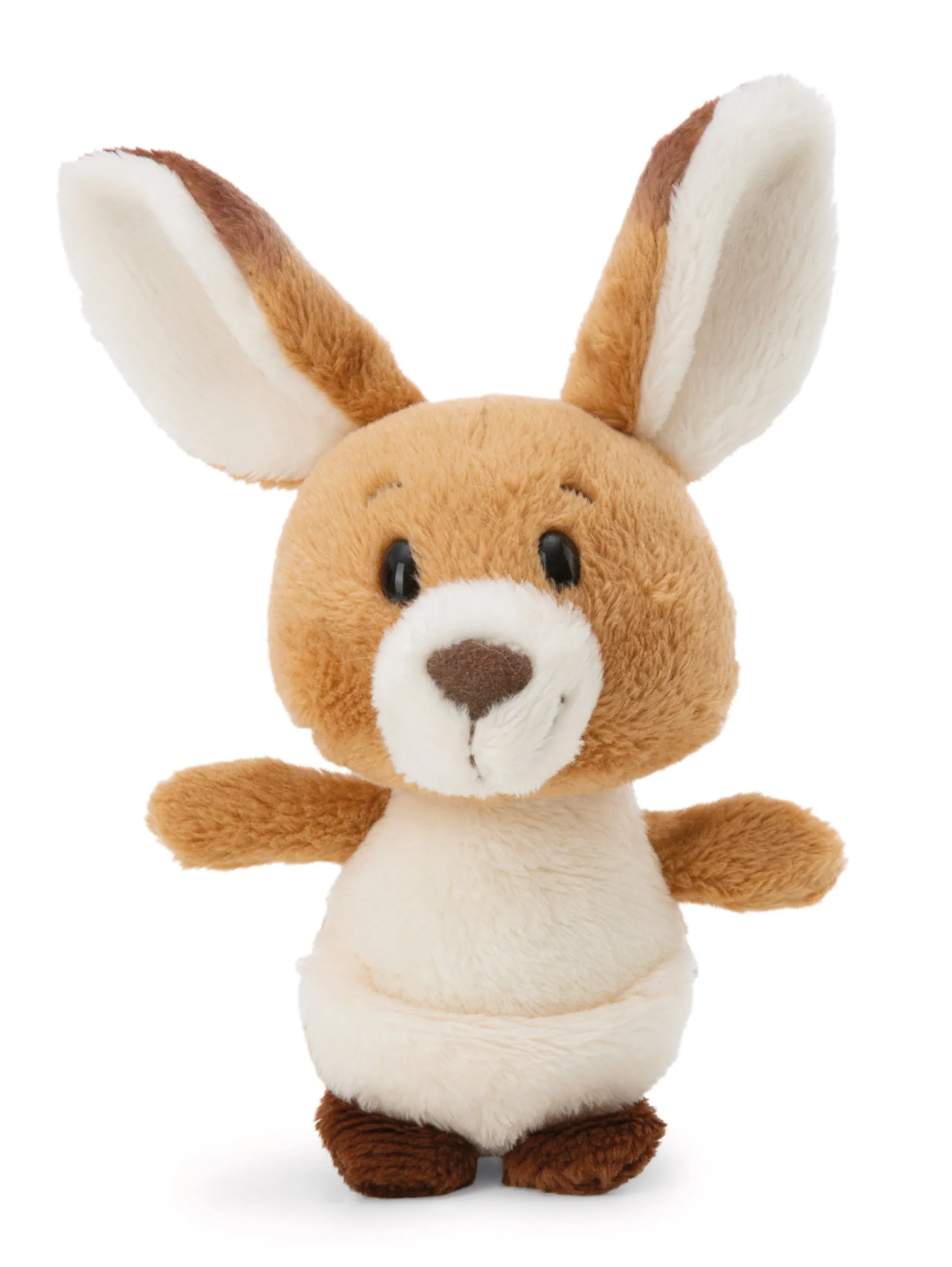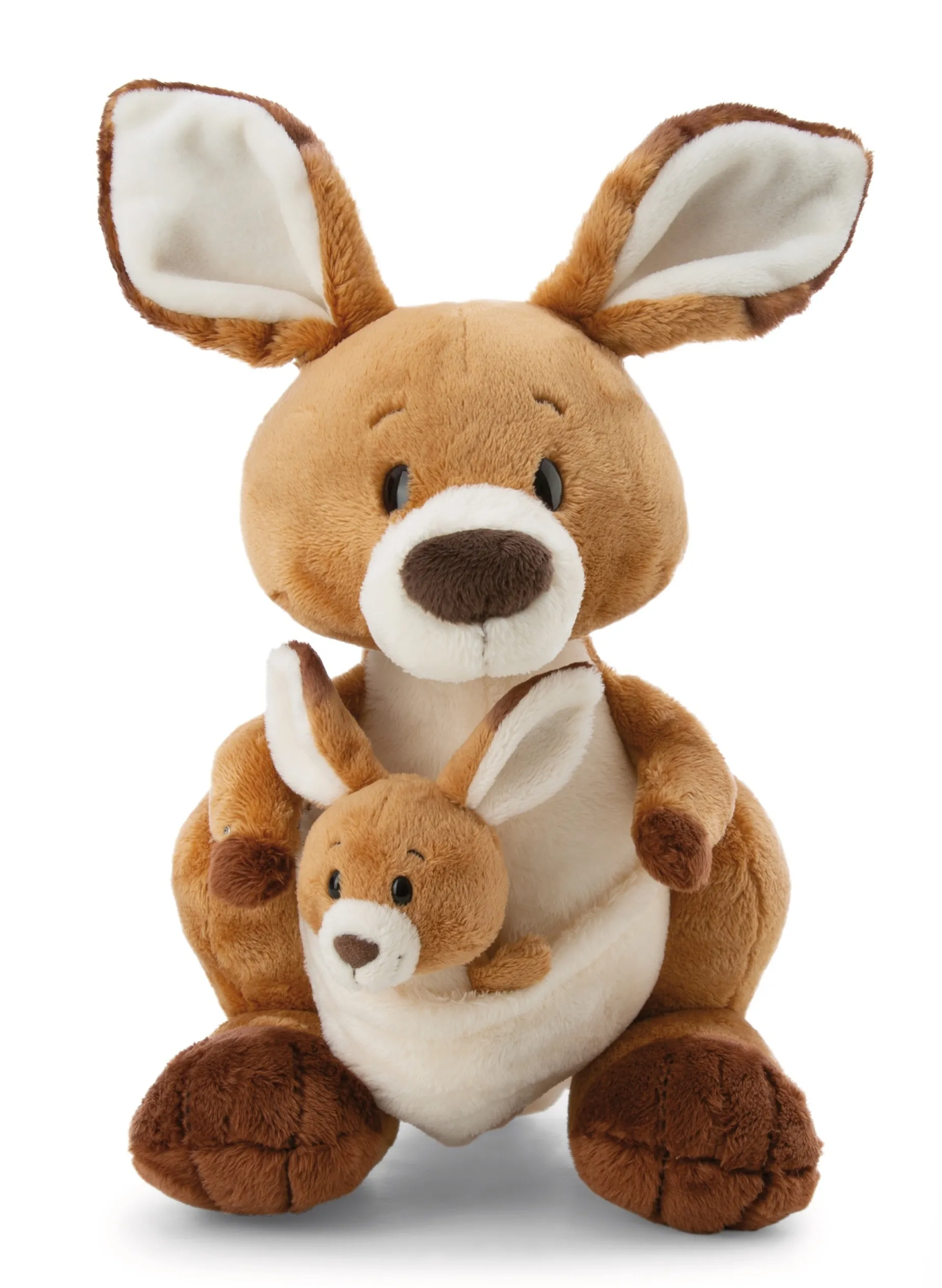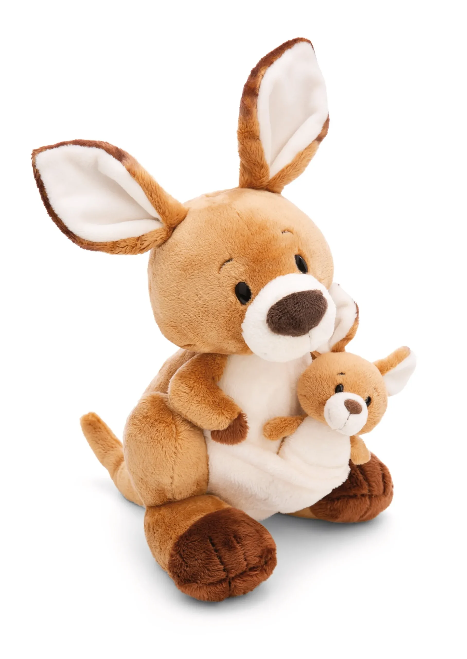 Kangaroo Kelly (25cm) from the Wild Friends collection by NICI doesn’t come alone! No, Kelly is bringing her little one (10cm) with her, which she proudly carries in her pouch in front of her belly. With soft plush fur in two different shades of brown and white, adorable faces and big ears, the two kangaroos exude a gentle friendliness and will win the hearts of young and old alike. The baby, who can also be played with individually, looks out cheerfully from its safe home. Kelly stands securely on her strong legs and looks forward to extensive play adventures and cuddles. Perfect for all kangaroo fans looking for loyal companions. The soft toy couple is part of the NICI GREEN product world. For NICI GREEN products, we almost exclusively use plush and filling material made from recycled materials. Primarily recycled PET bottles are processed into RPET for this purpose.